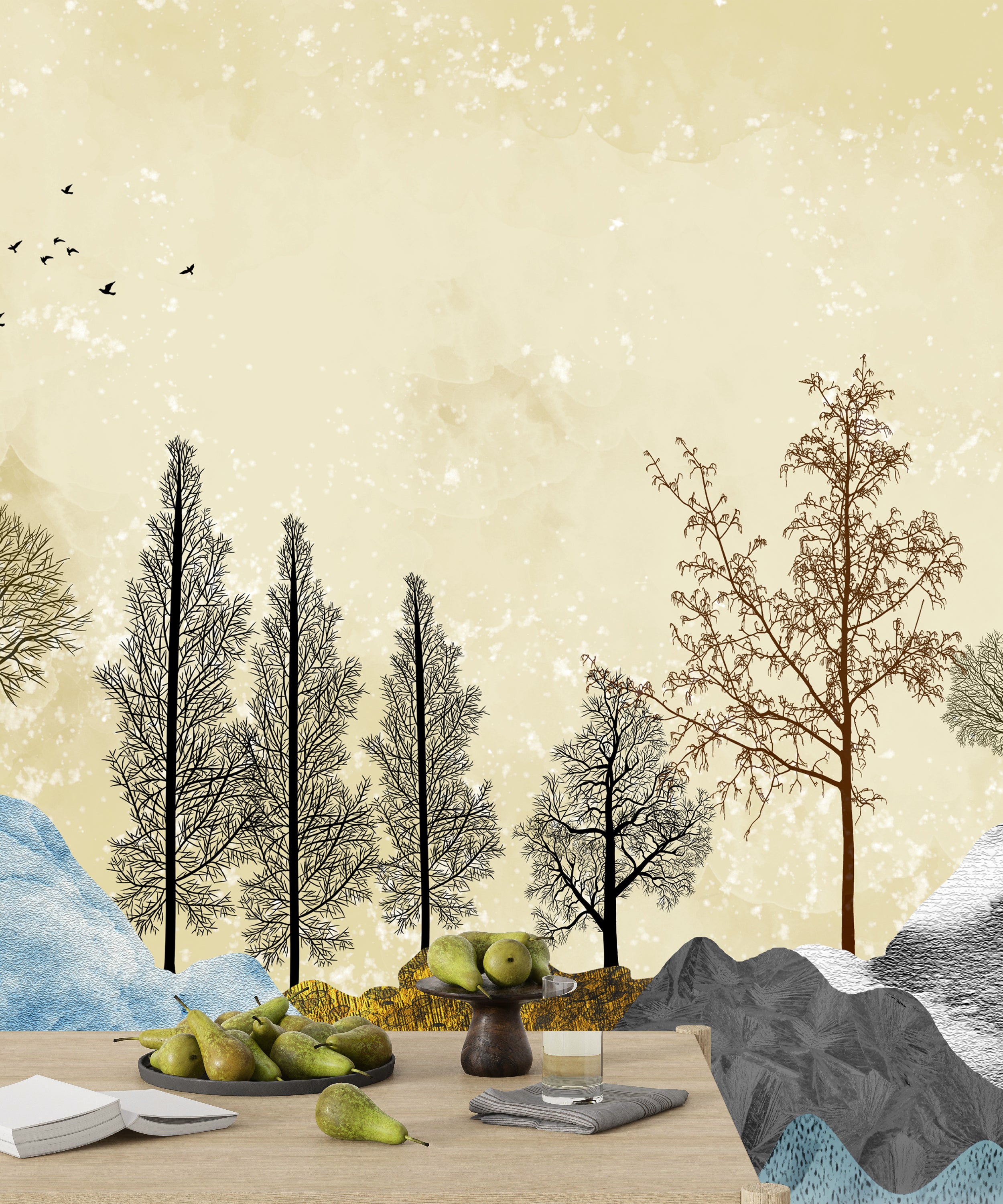 Golden Trees Wallpaper, Abstract Landscape Mural, Oversized Custom Size Wall Art, Non-Woven, Non-Adhesive, Modern Wall Paper, Removable