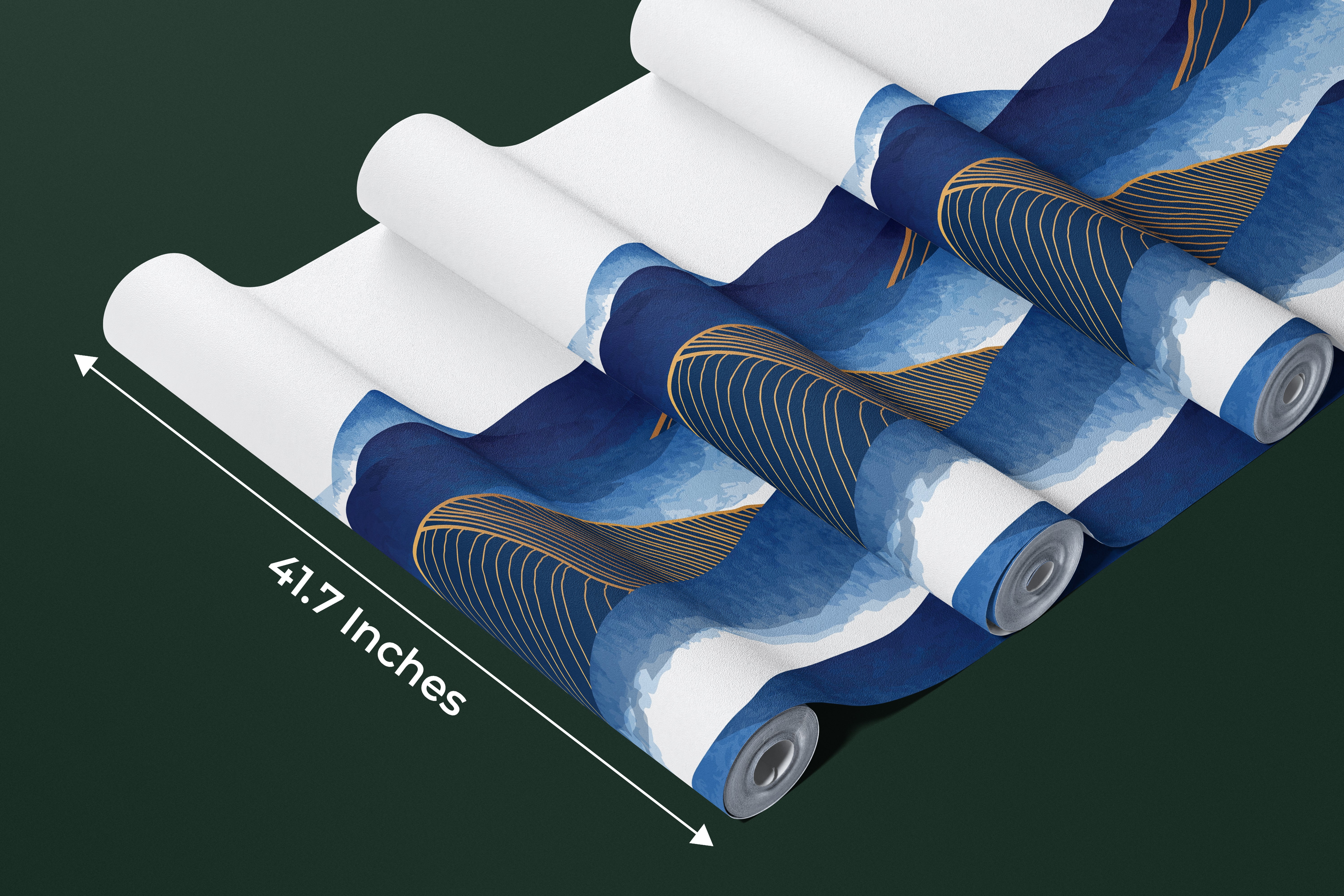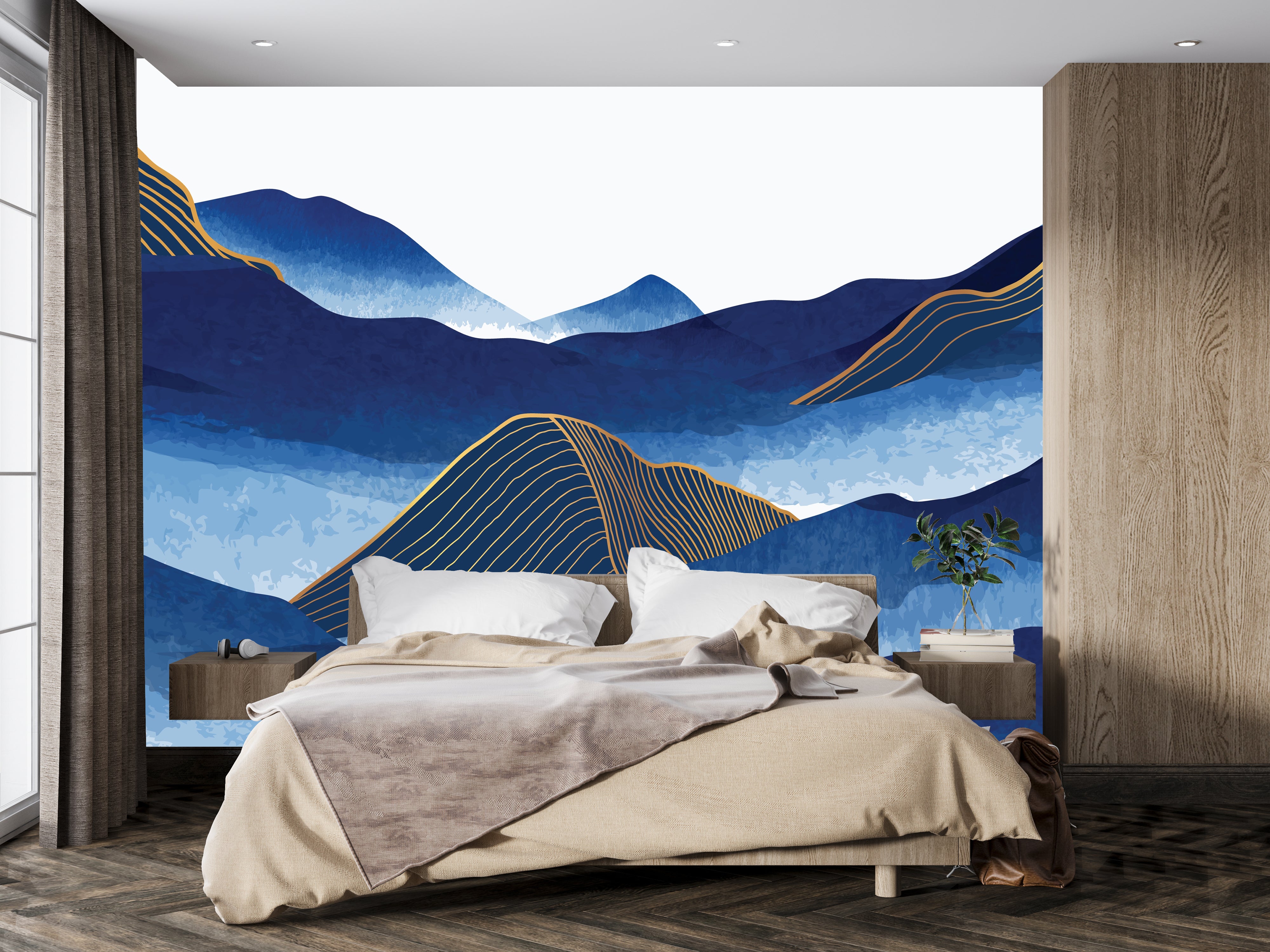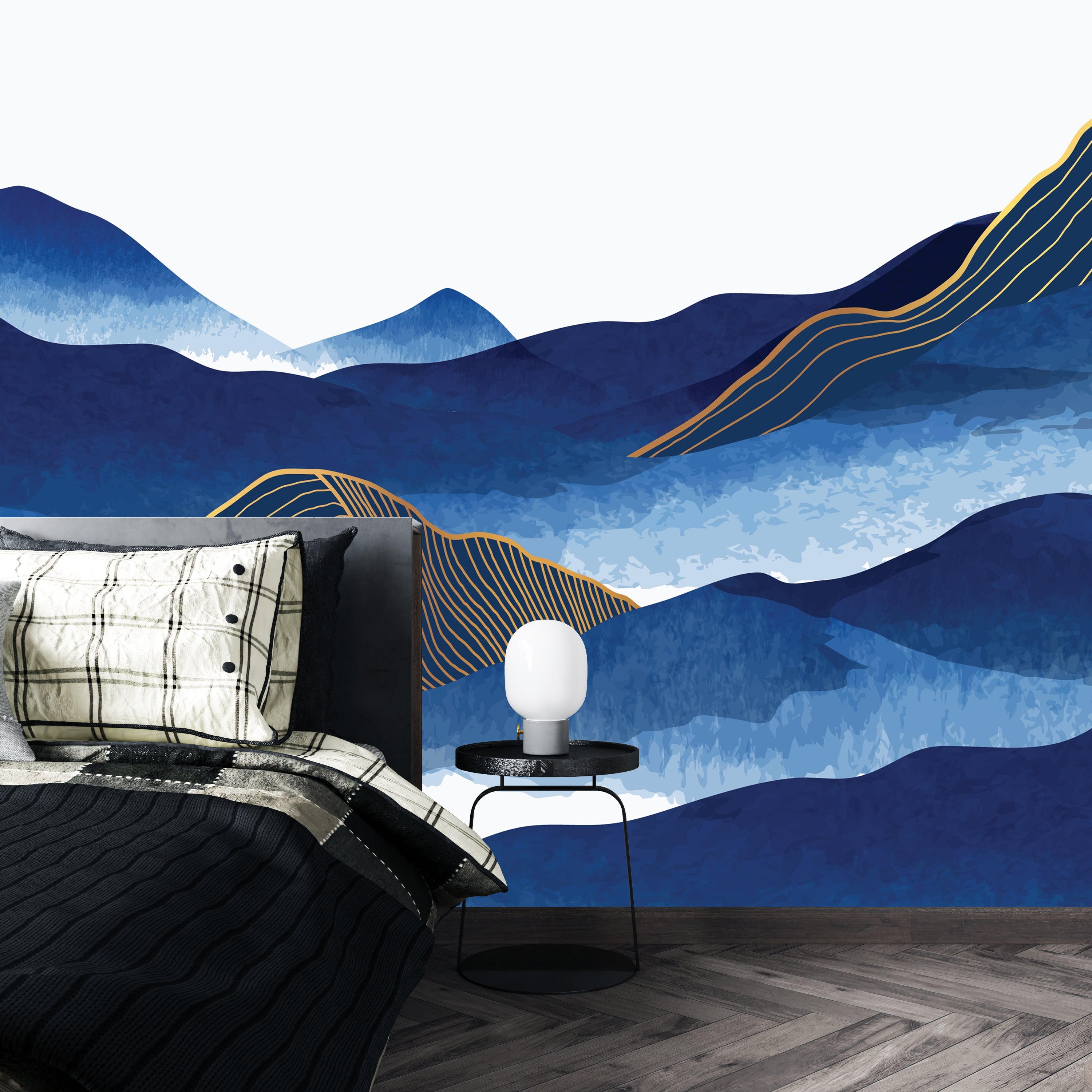 Blue Mountain Wallpaper, Golden Lines Mural, Oversized Custom Size Wall Art, Non-Woven, Non-Adhesive, Modern Wall Paper, Removable