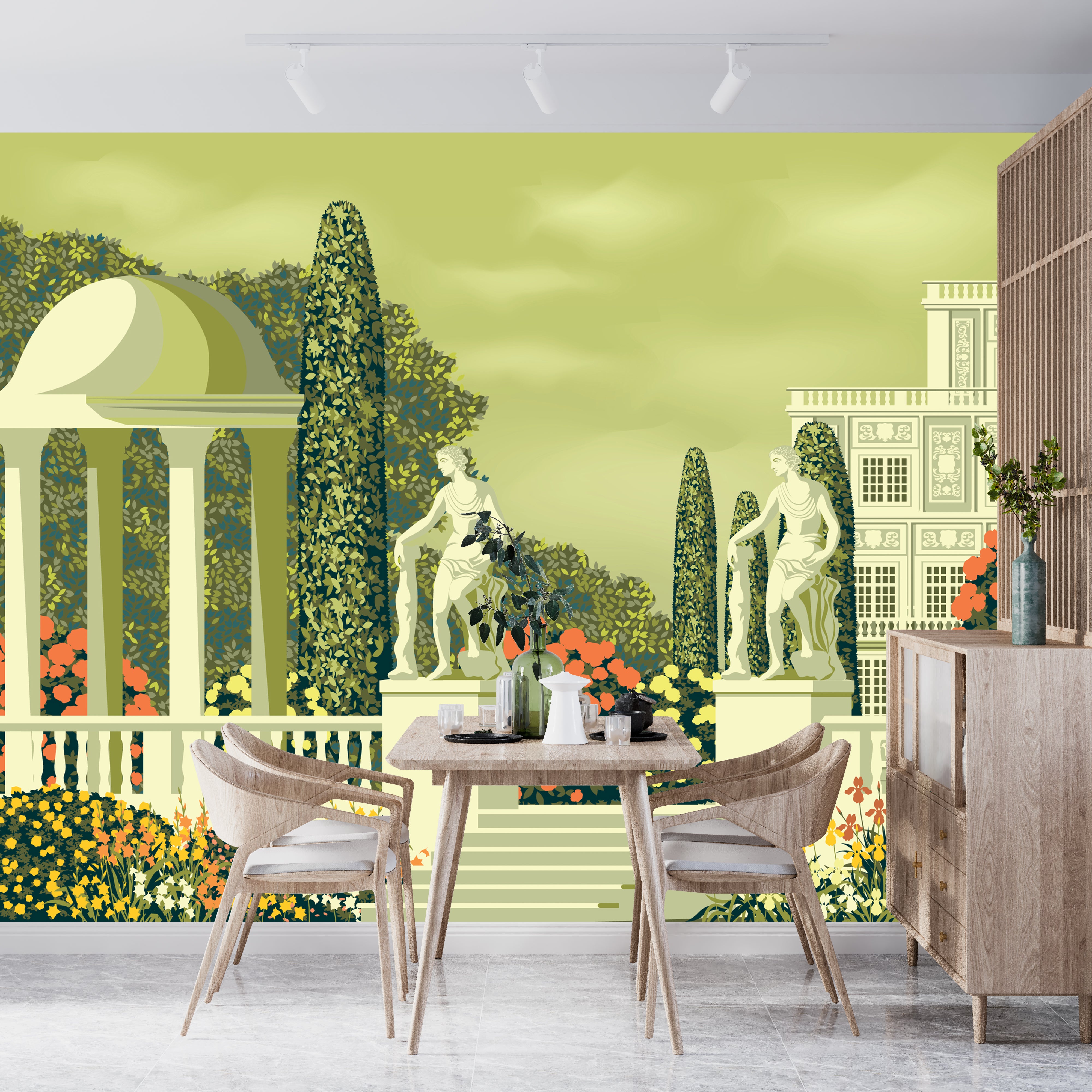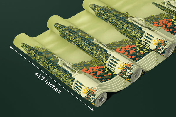 Flower Garden Wallpaper, Country House and Statues Mural, Oversized Custom Size Wall Art, Non-Woven, Non-Adhesive, Modern Wall Paper, Removable