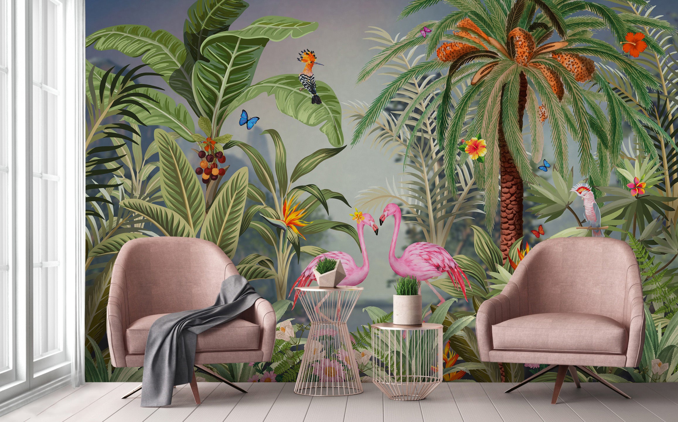 Flamingo Nature Theme Wall Mural, Green Forest Wallpaper, Custom Wall Mural, Wall Poster Home Interior Decor, Non-Adhesive, Non-Woven, Washable, Removable