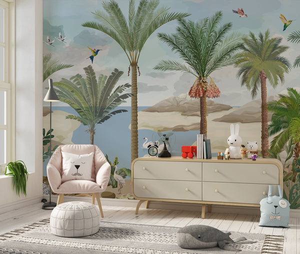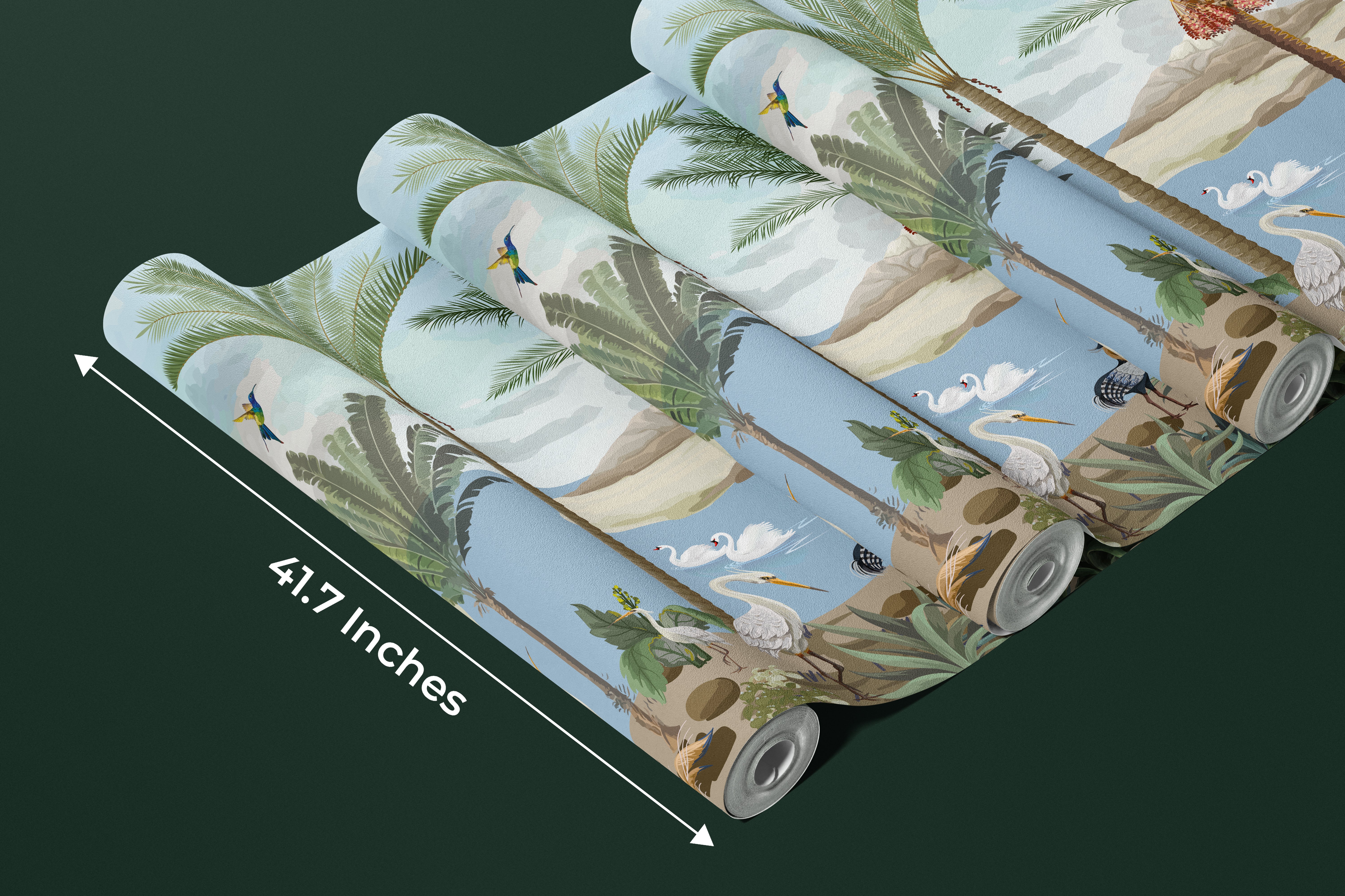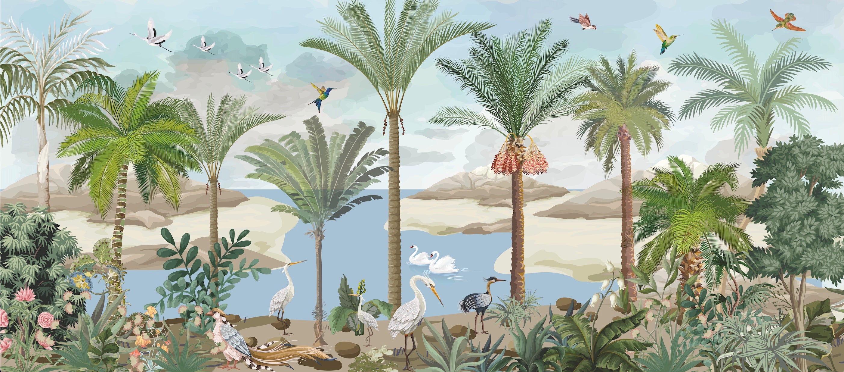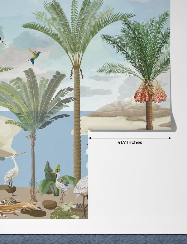 South Asian Subcontinent Wallpaper, Palm Trees, Birds Mural, Oversized Custom Size Wall Art, Non-Woven, Non-Adhesive, Modern Wall Paper, Removable
