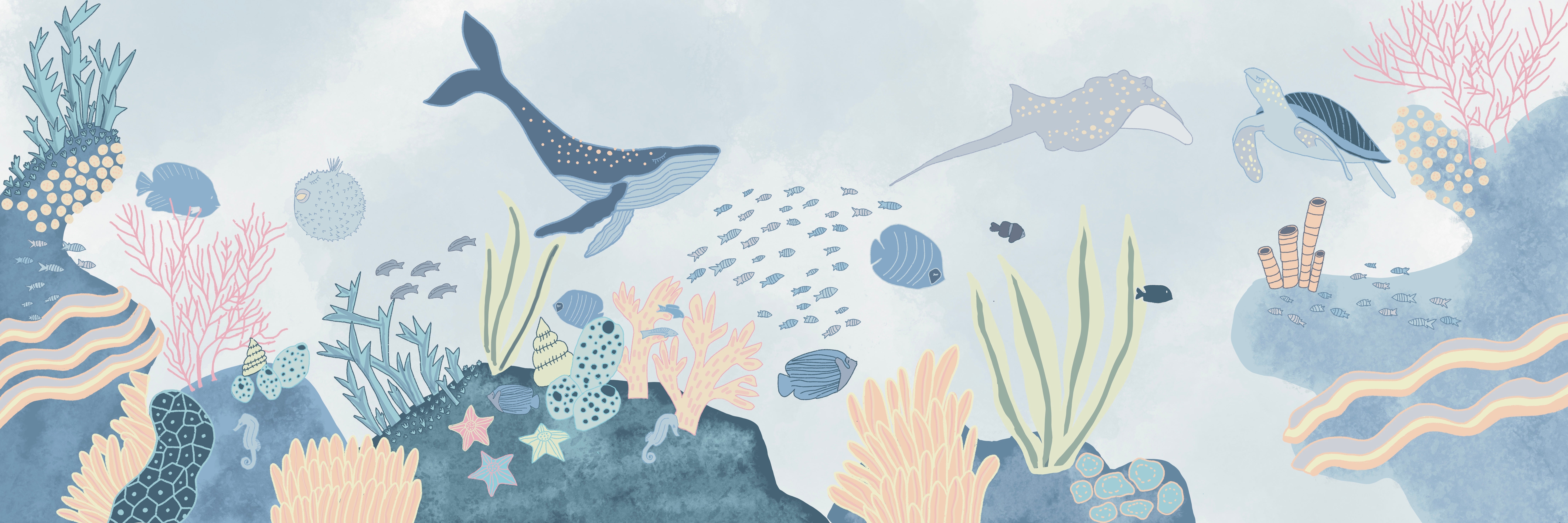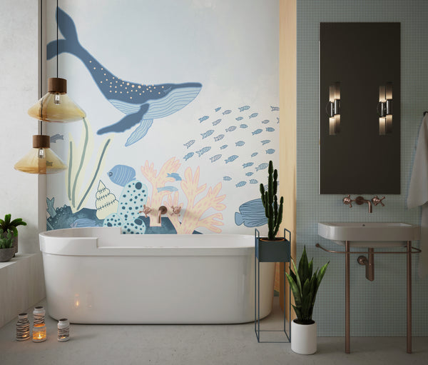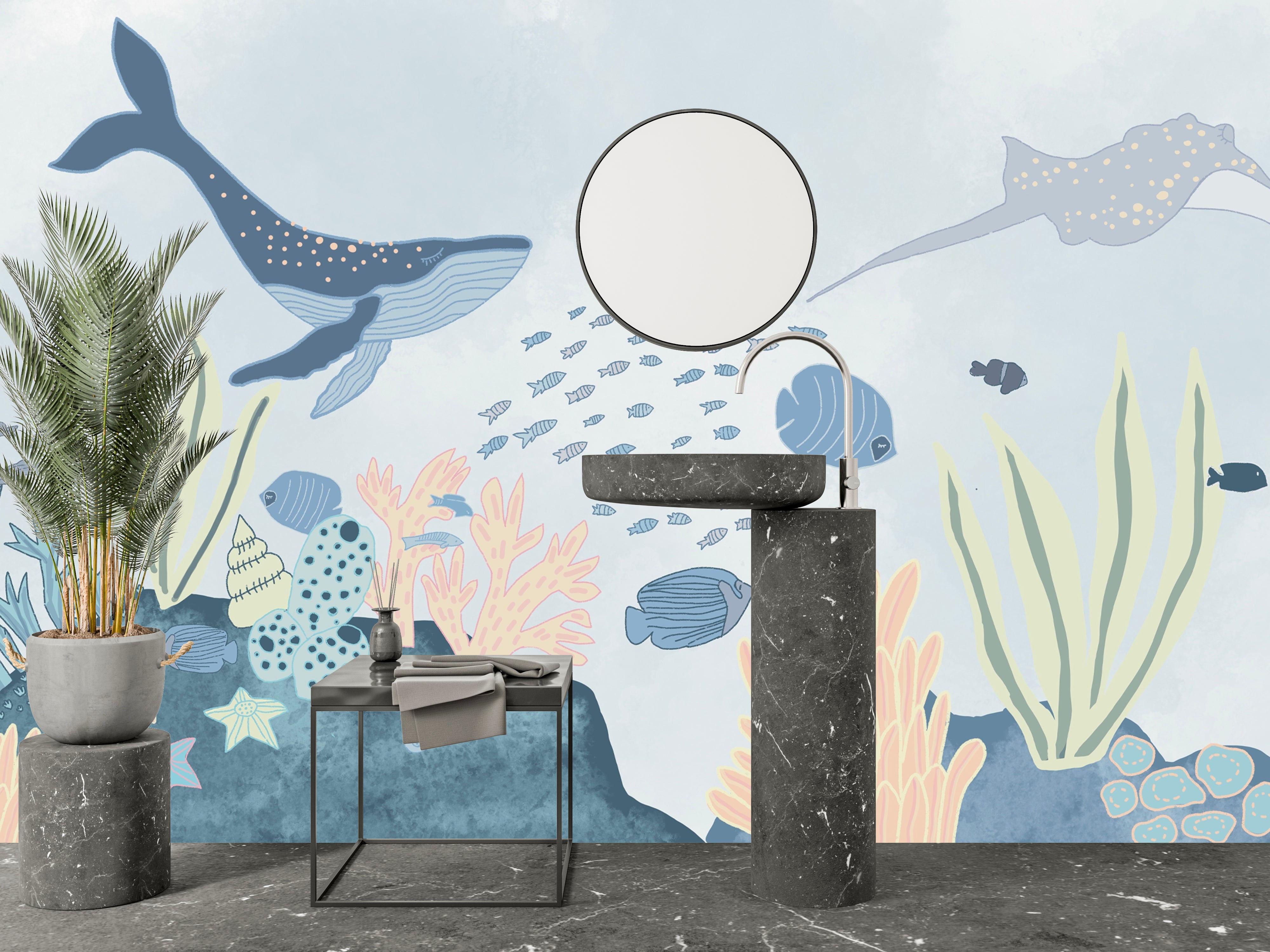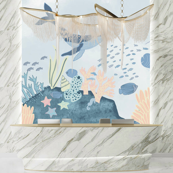 Under the Sea Wallpaper, Sea Animals Mural, Oversized Custom Size Wall Art, Non-Woven, Non-Adhesive, Modern Wall Paper, Removable