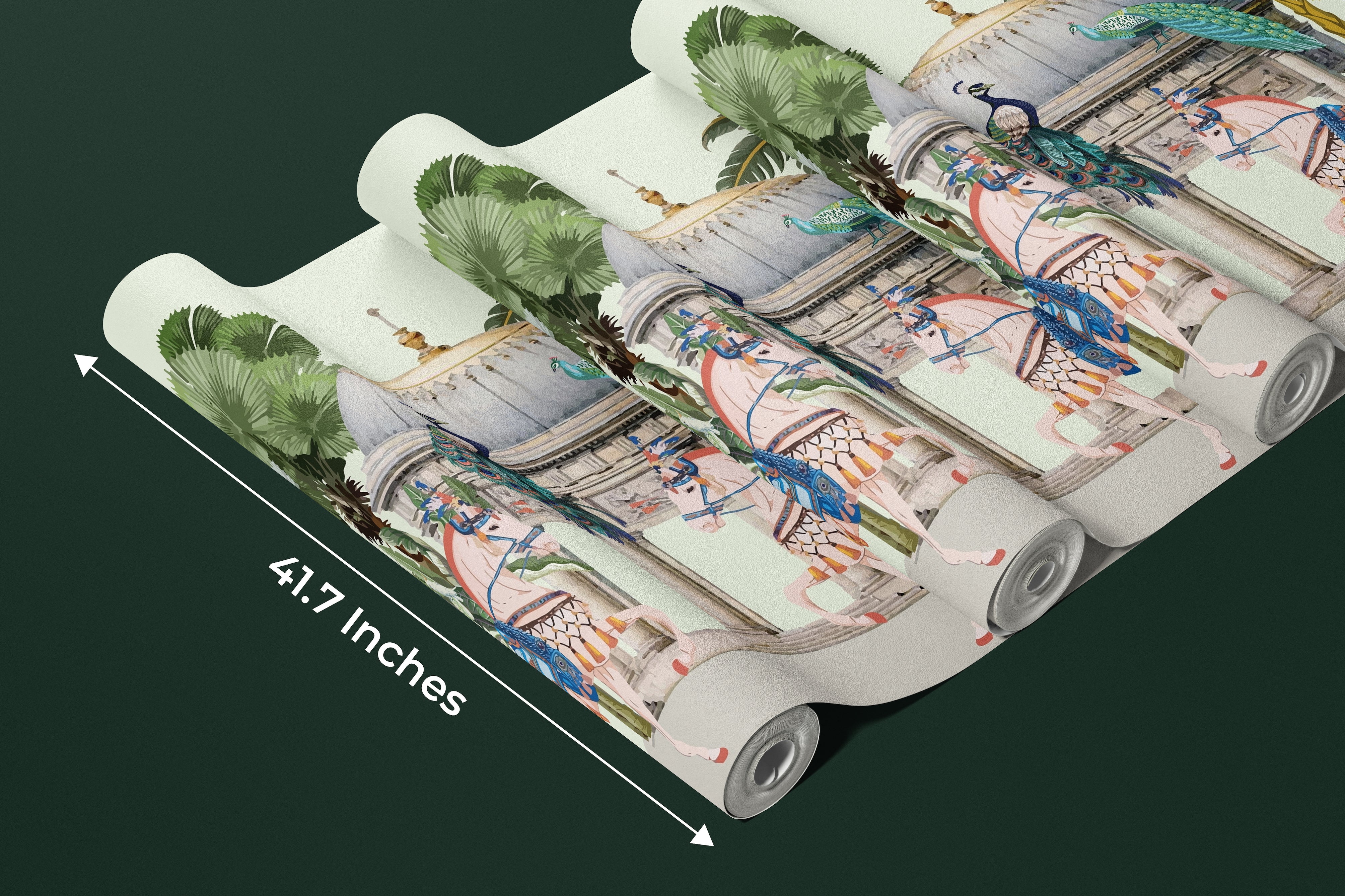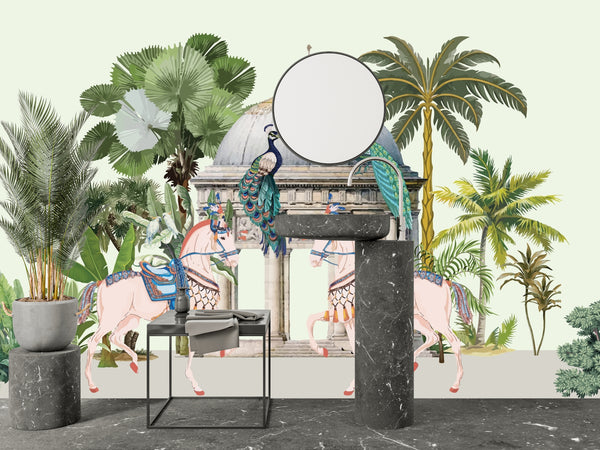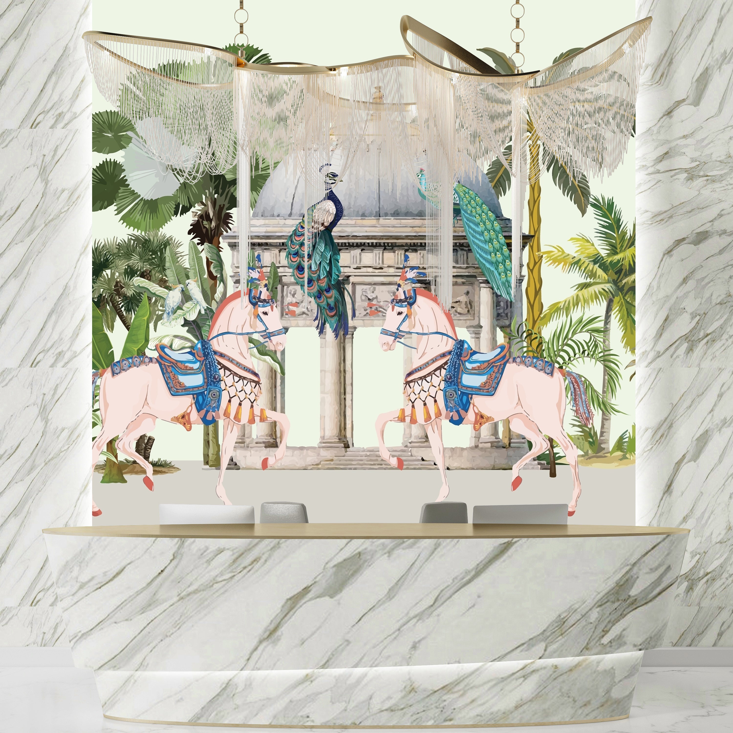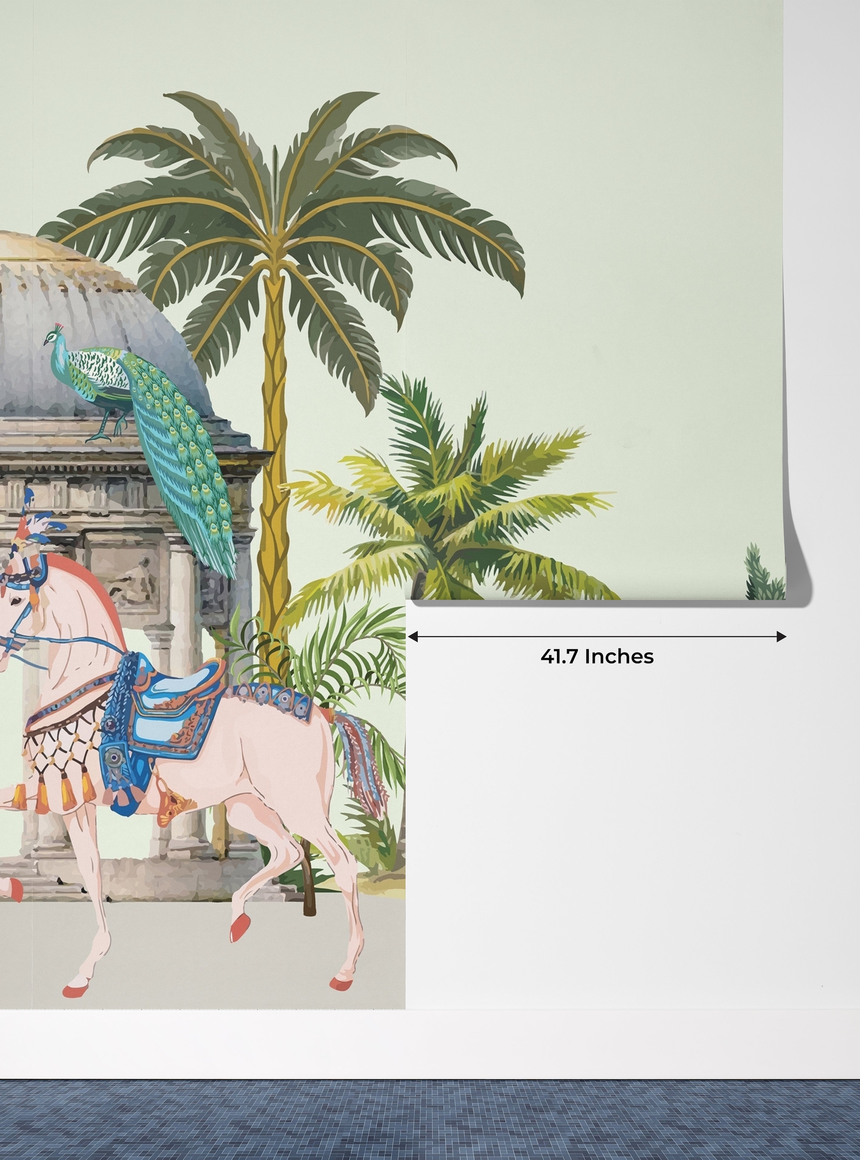 Traditional Mughal Garden Wallpaper, Peacock, Horses Mural, Oversized Custom Size Wall Art, Non-Woven, Non-Adhesive, Modern Wall Paper, Removable