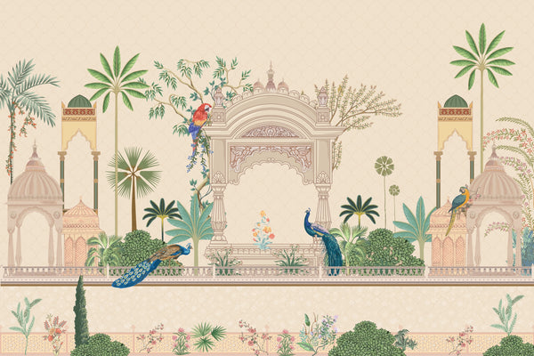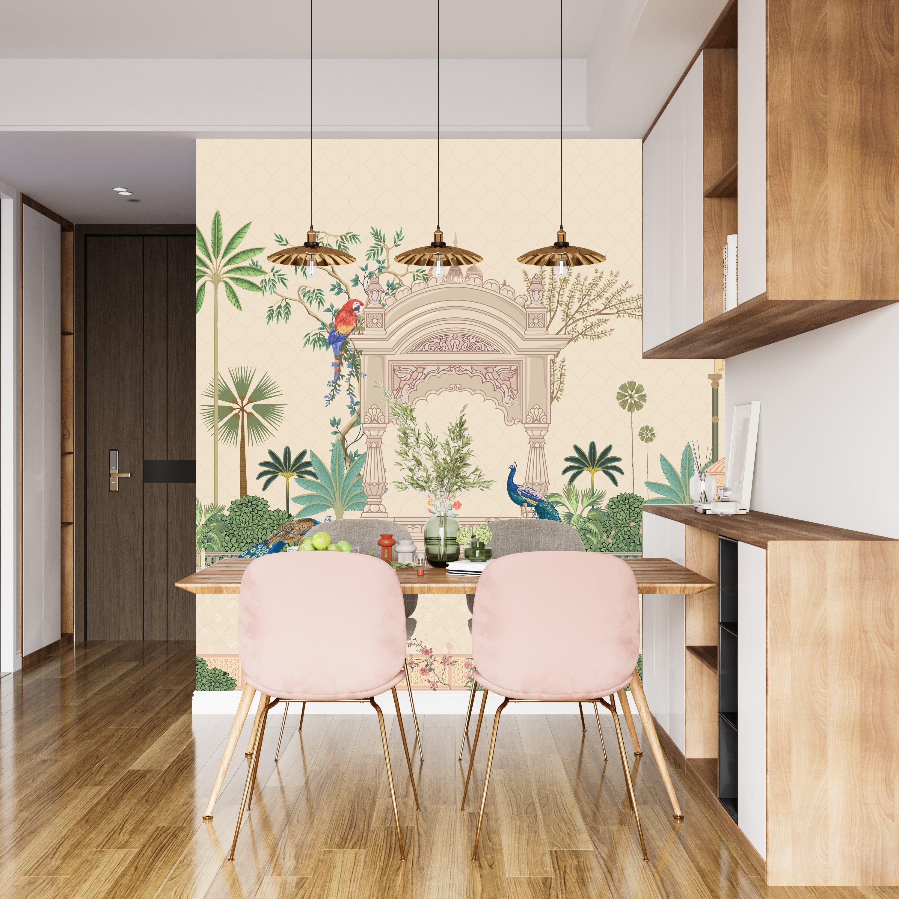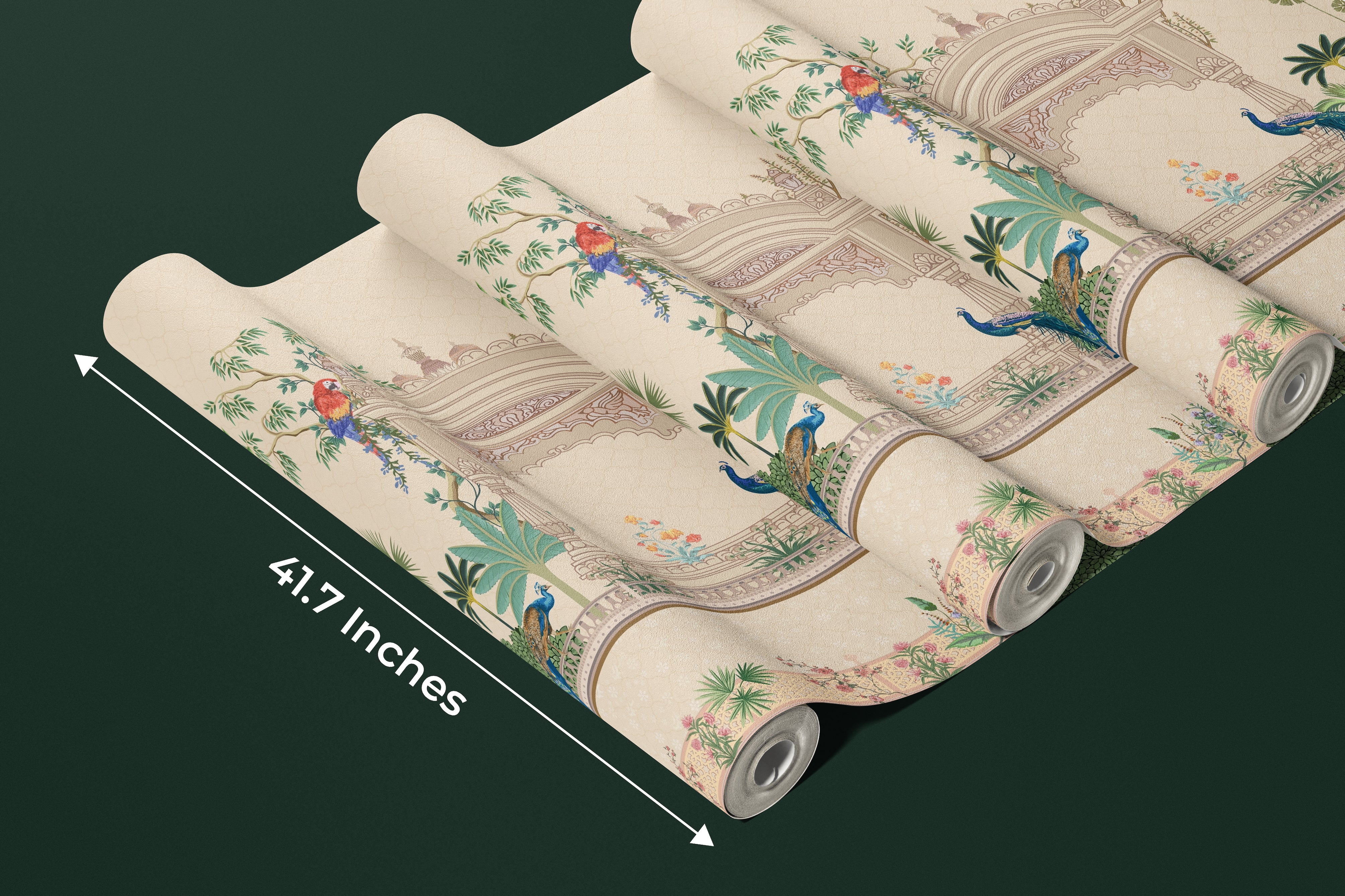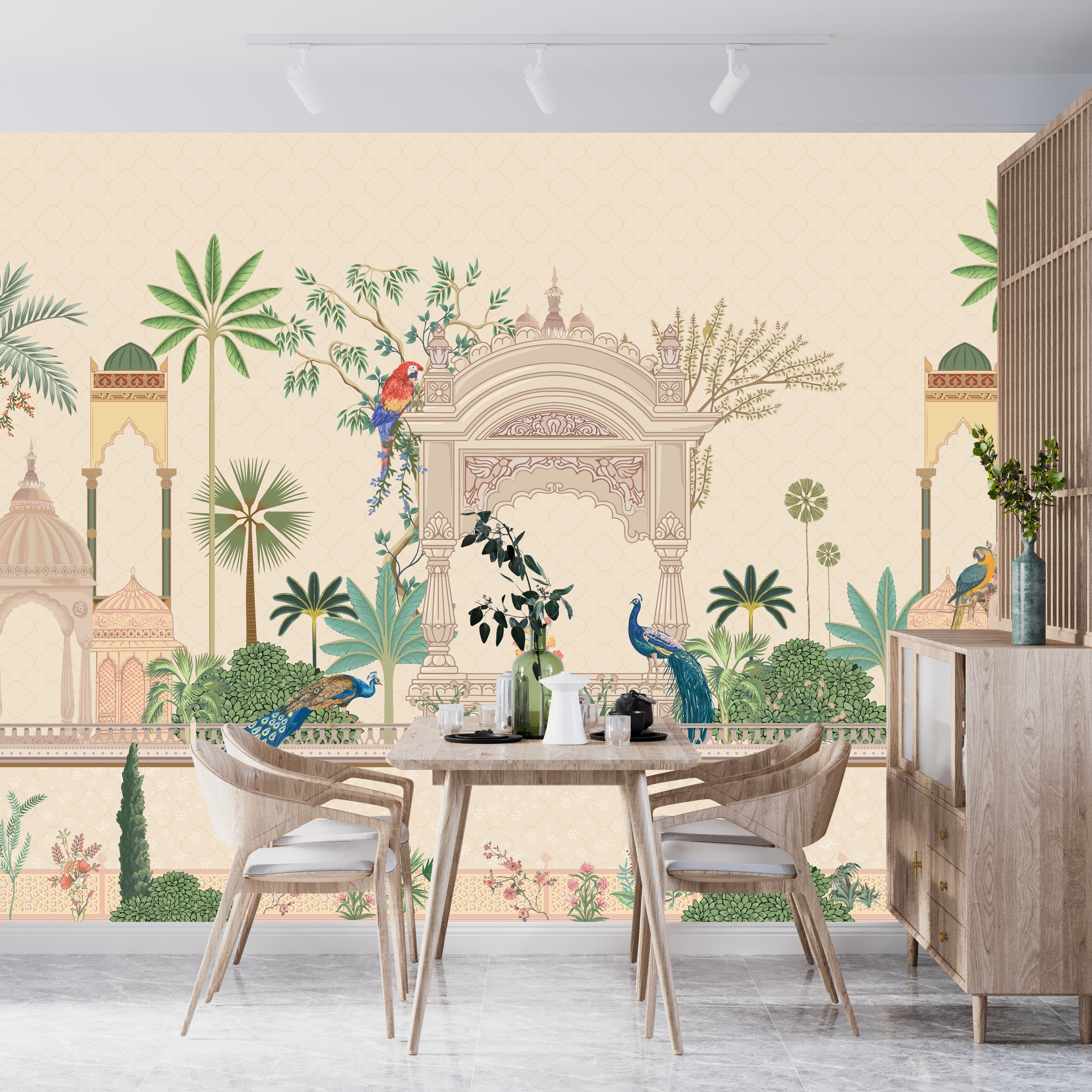 Mughal Garden Wallpaper, Peacock, Parrot Mural, Oversized Custom Size Wall Art, Non-Woven, Non-Adhesive, Modern Wall Paper, Removable