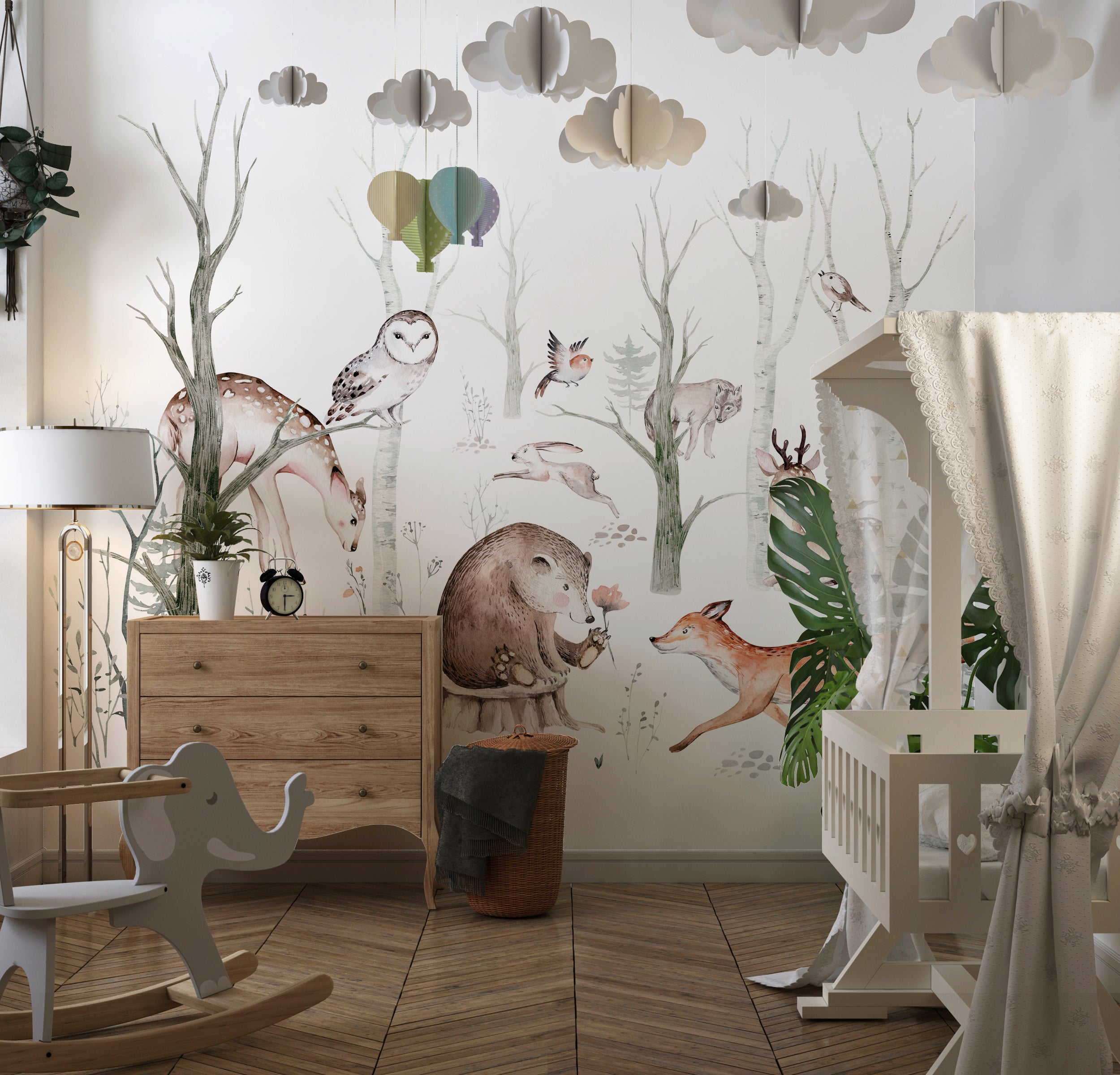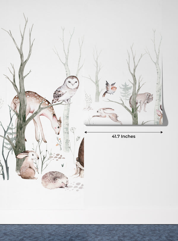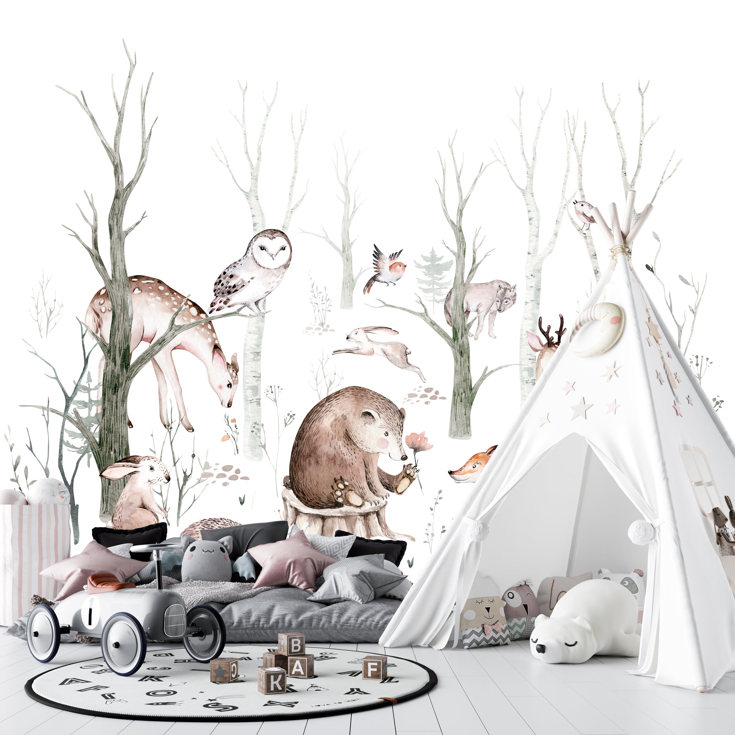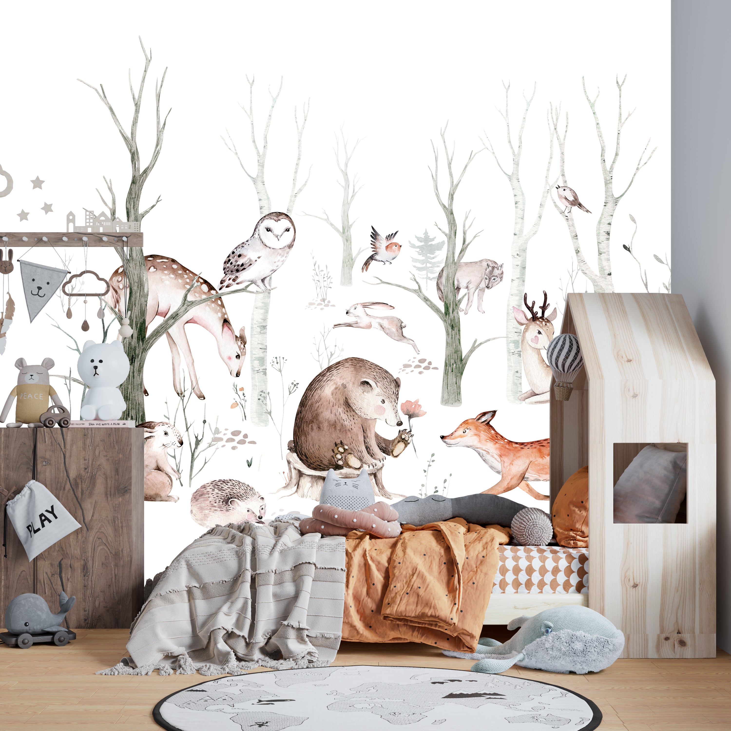 Cute Animals, Trees Wallpaper, White Background Mural, Oversized Custom Size Wall Art, Non-Woven, Non-Adhesive, Modern Wall Paper, Removable