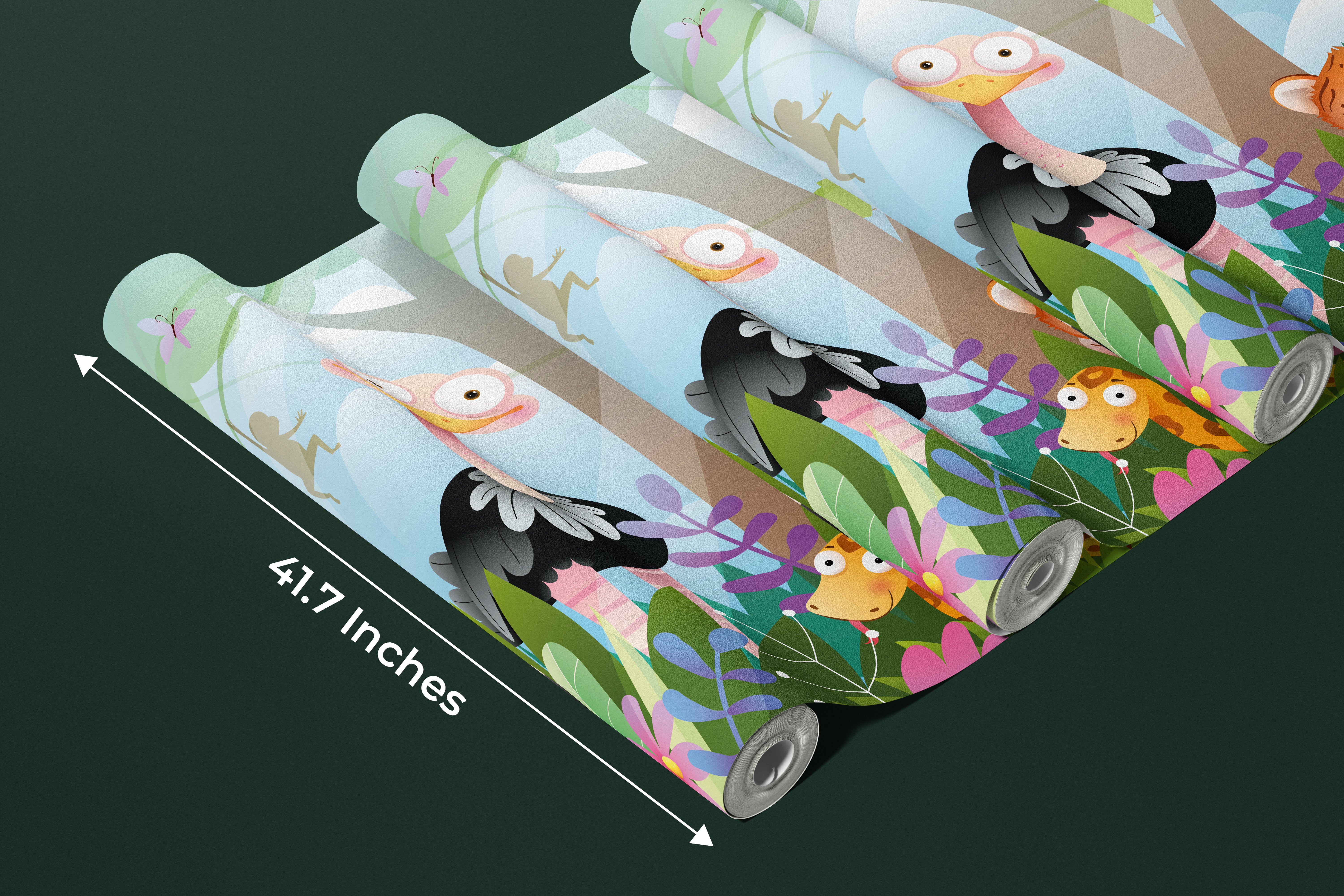 Kids Animals in Jungle Wallpaper, Wild Tropical Mural, Oversized Custom Size Wall Art, Non-Woven, Non-Adhesive, Modern Wall Paper, Removable
