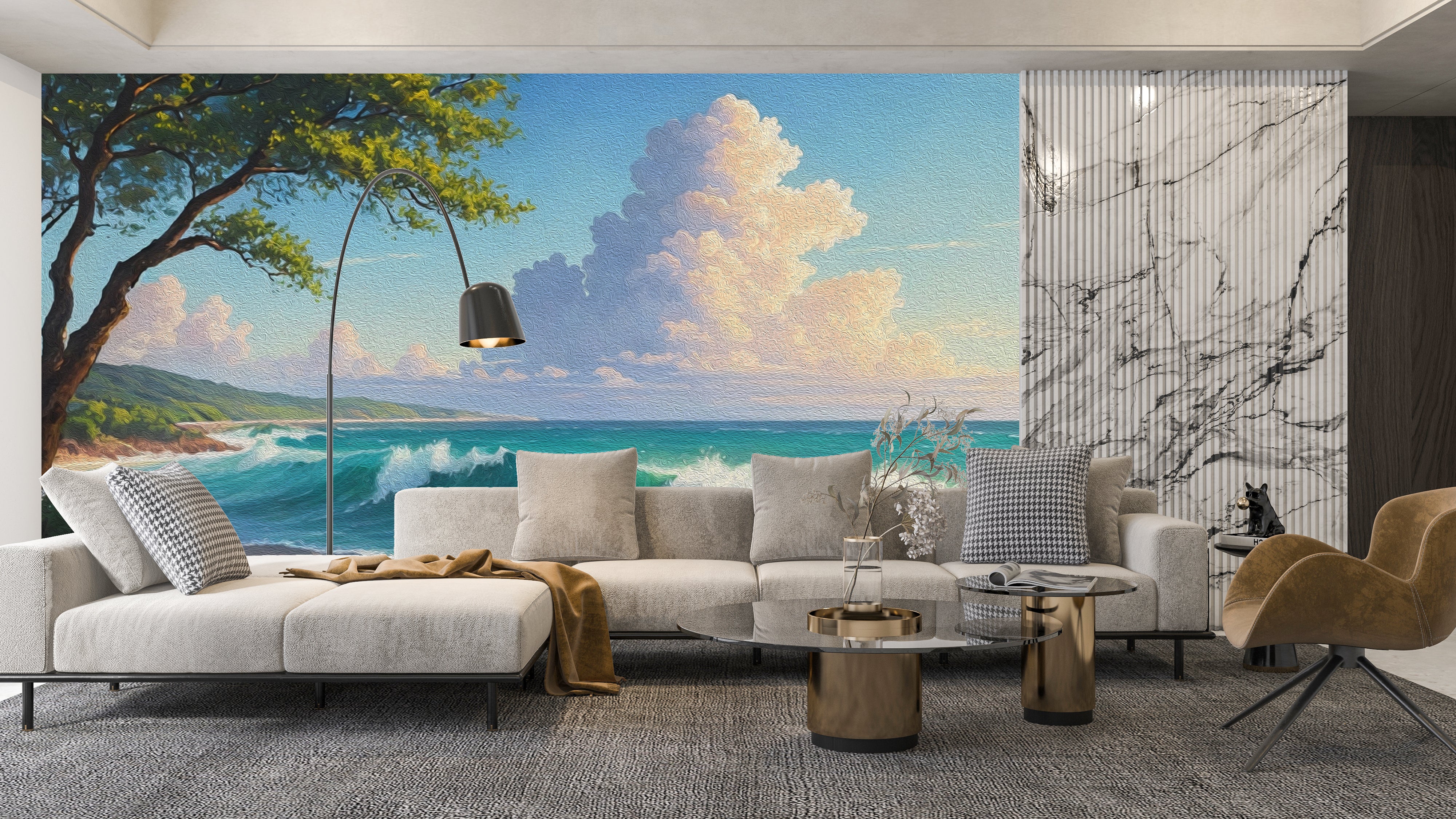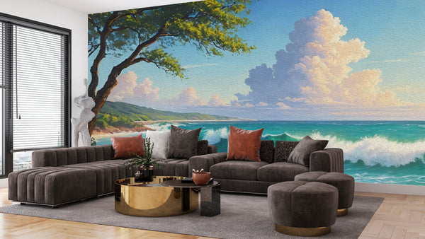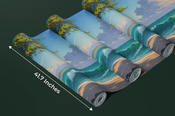 Beautiful Sea Waves and Tree Wallpaper, Oil Painting Mural, Oversized Custom Size Wall Art, Non-Woven, Non-Adhesive, Modern Wall Paper, Removable