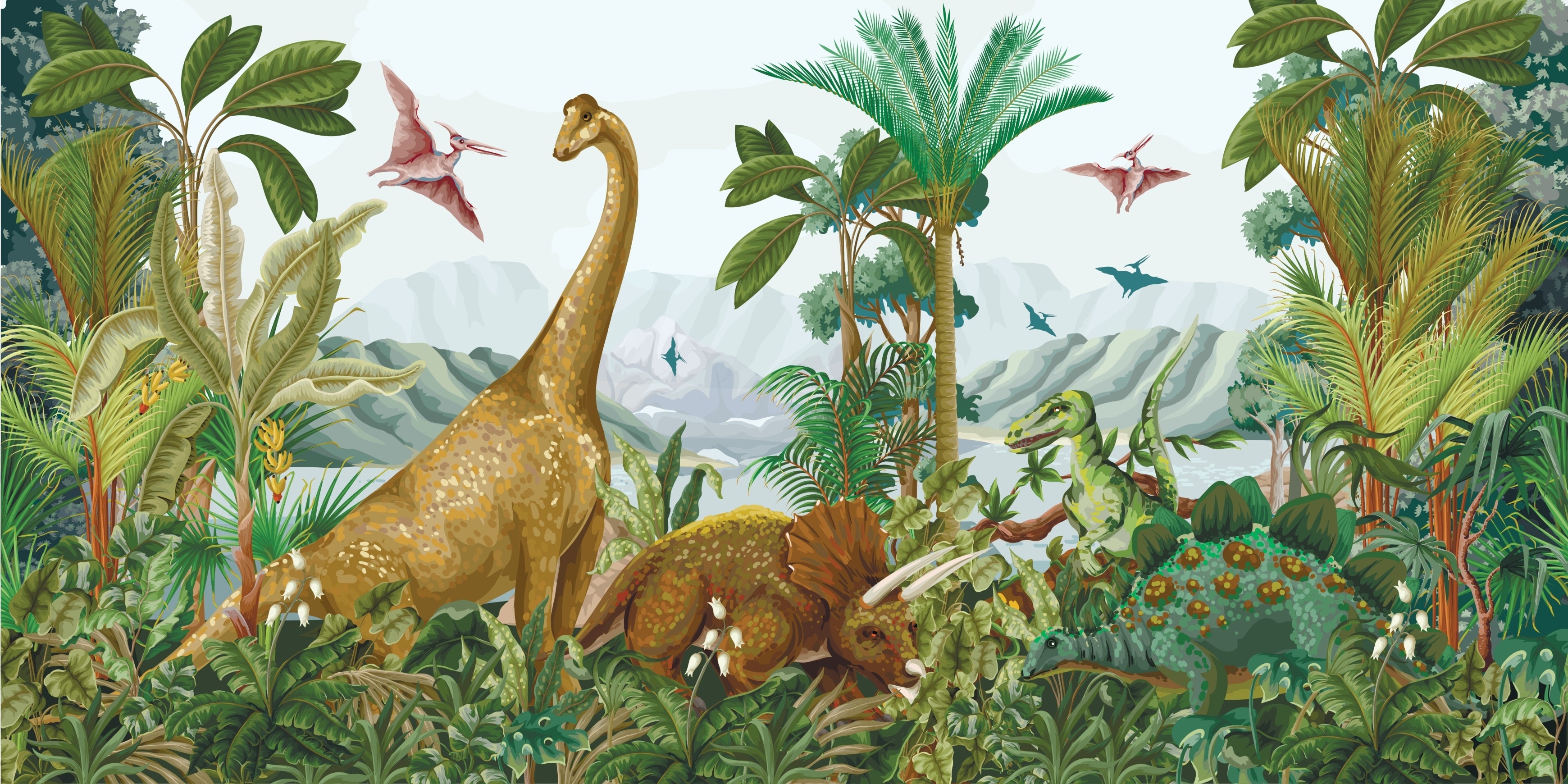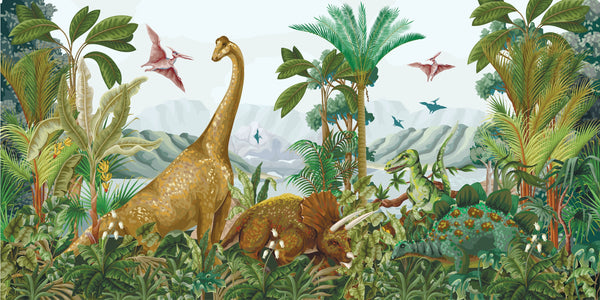 Dino World Wallpaper, Palms Mural, Oversized Custom Size Wall Art, Non-Woven, Non-Adhesive, Modern Wall Paper, Removable