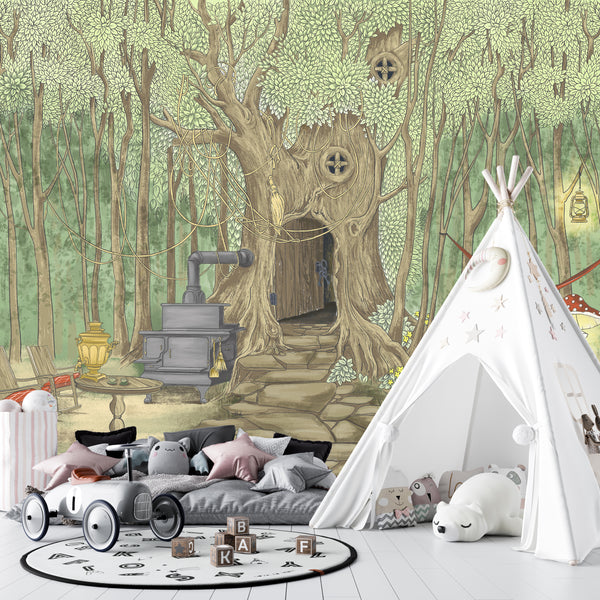 Tree House Wallpaper, Cozy Painted Style Mural, Oversized Custom Size Wall Art, Non-Woven, Non-Adhesive, Modern Wall Paper, Removable