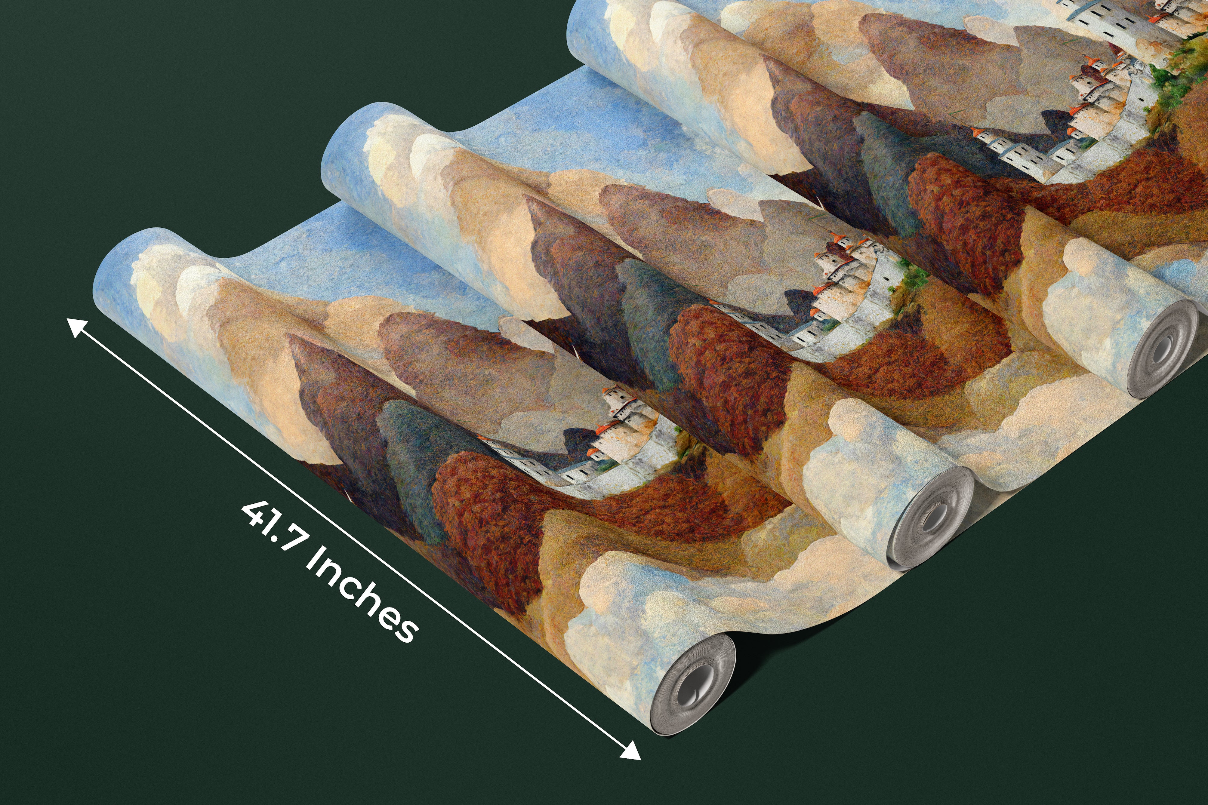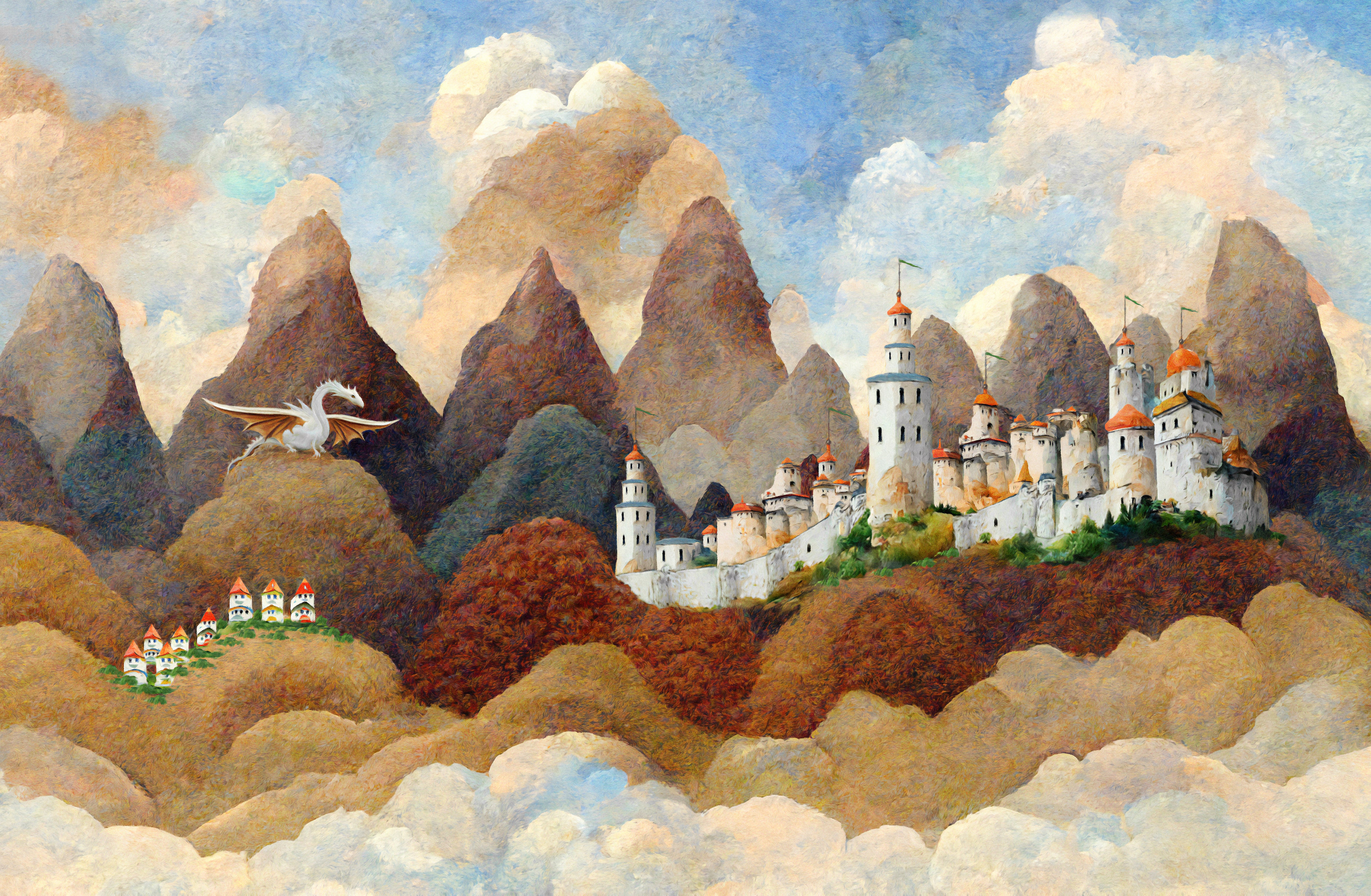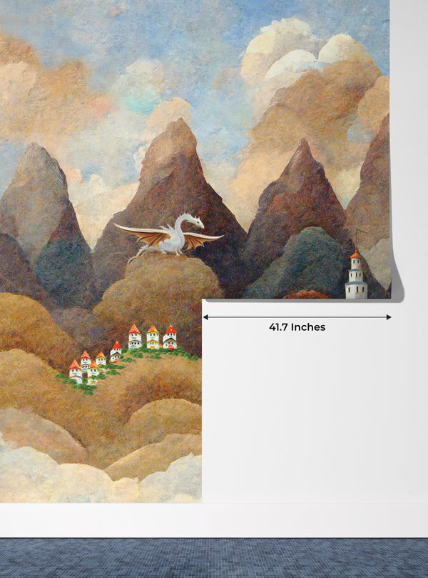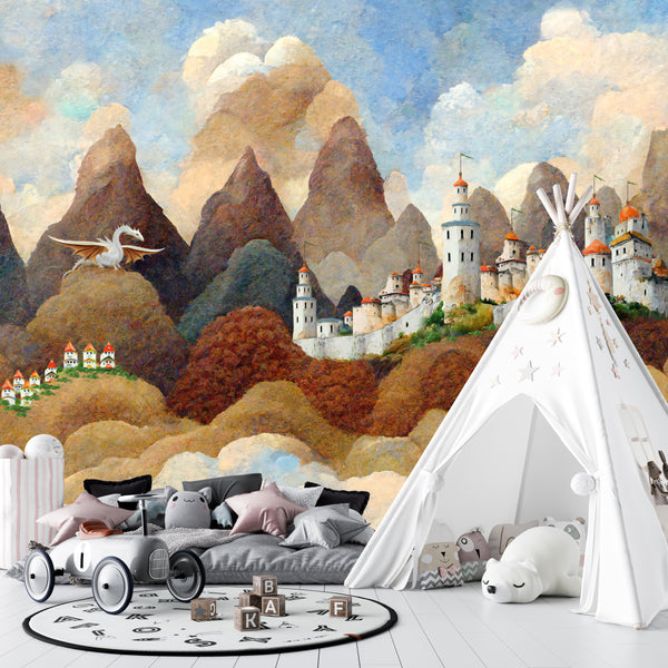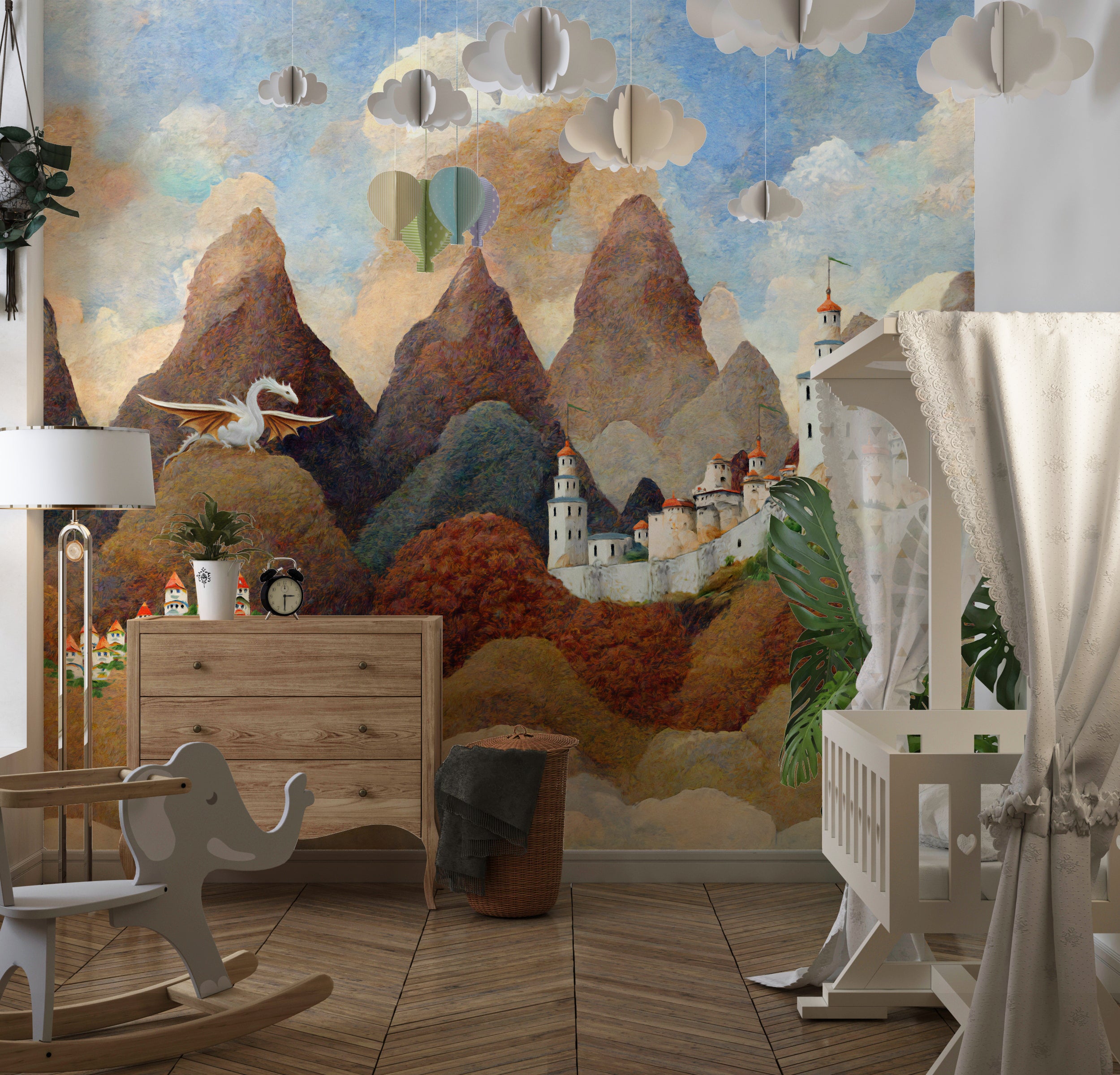 Castle and Dragon Wallpaper, Painted Style Mural, Oversized Custom Size Wall Art, Non-Woven, Non-Adhesive, Modern Wall Paper, Removable