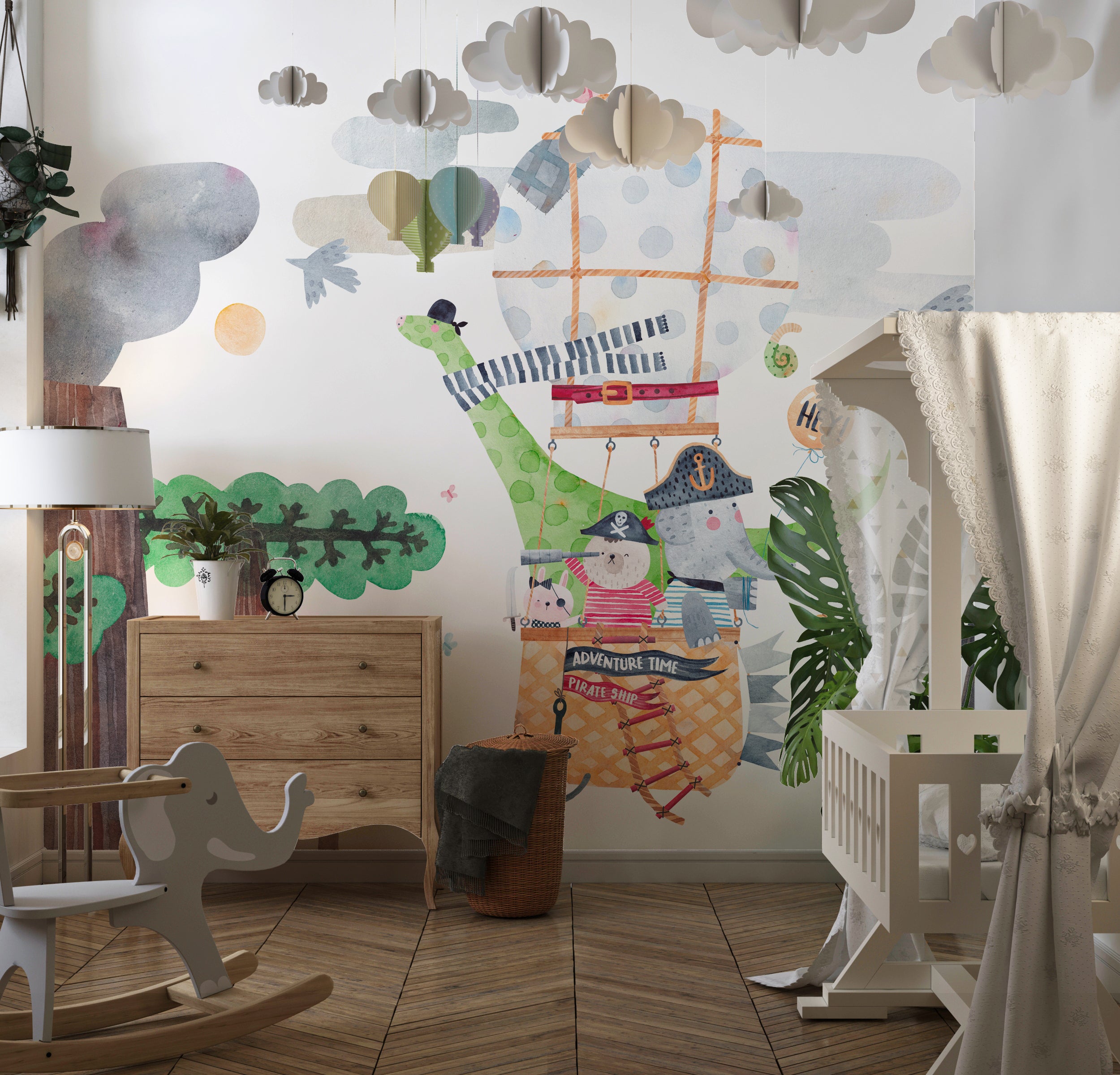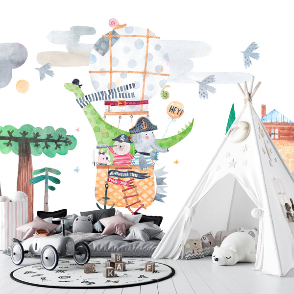 Cute Animals Wallpaper, Travelling by Balloon Mural, Oversized Custom Size Wall Art, Non-Woven, Non-Adhesive, Modern Wall Paper, Removable