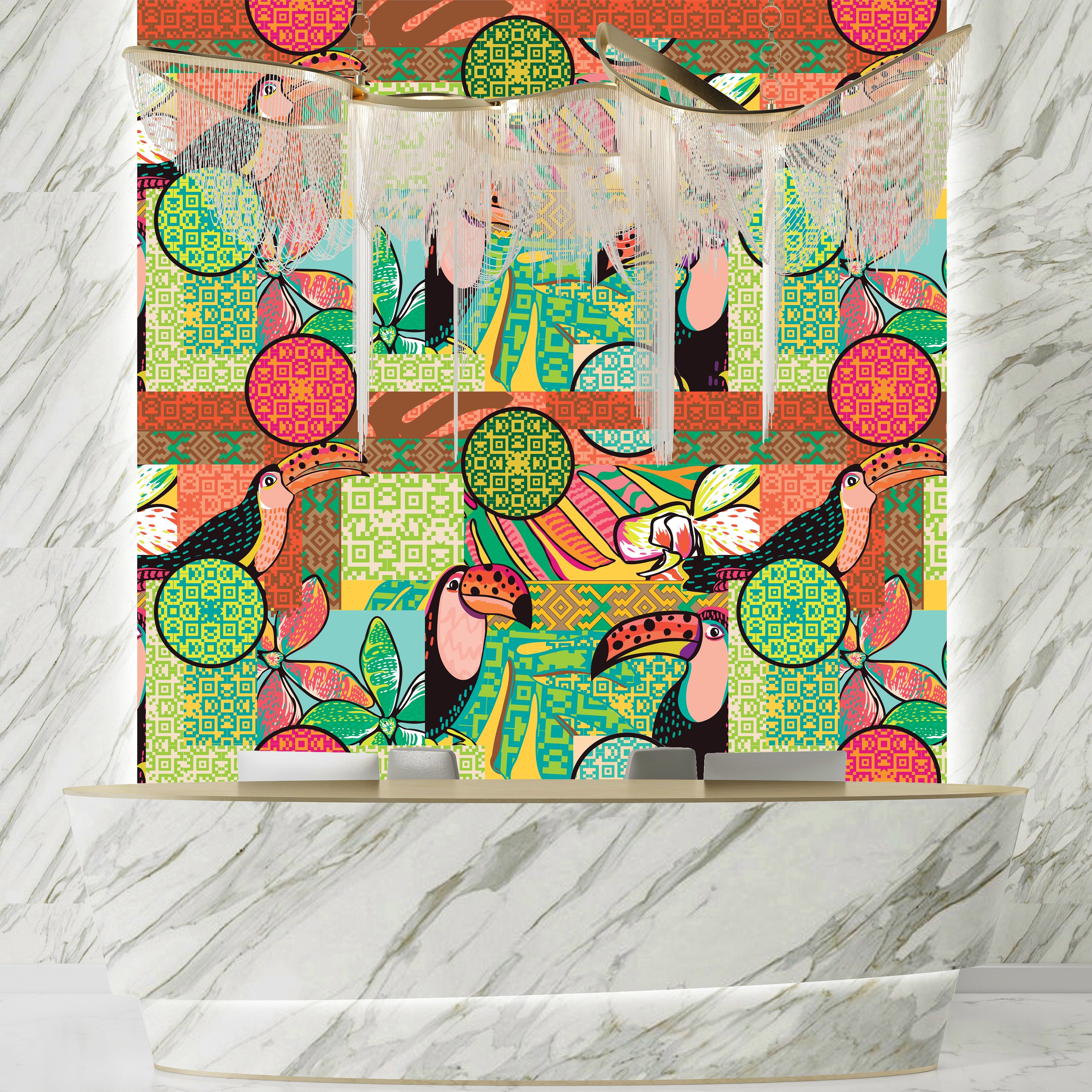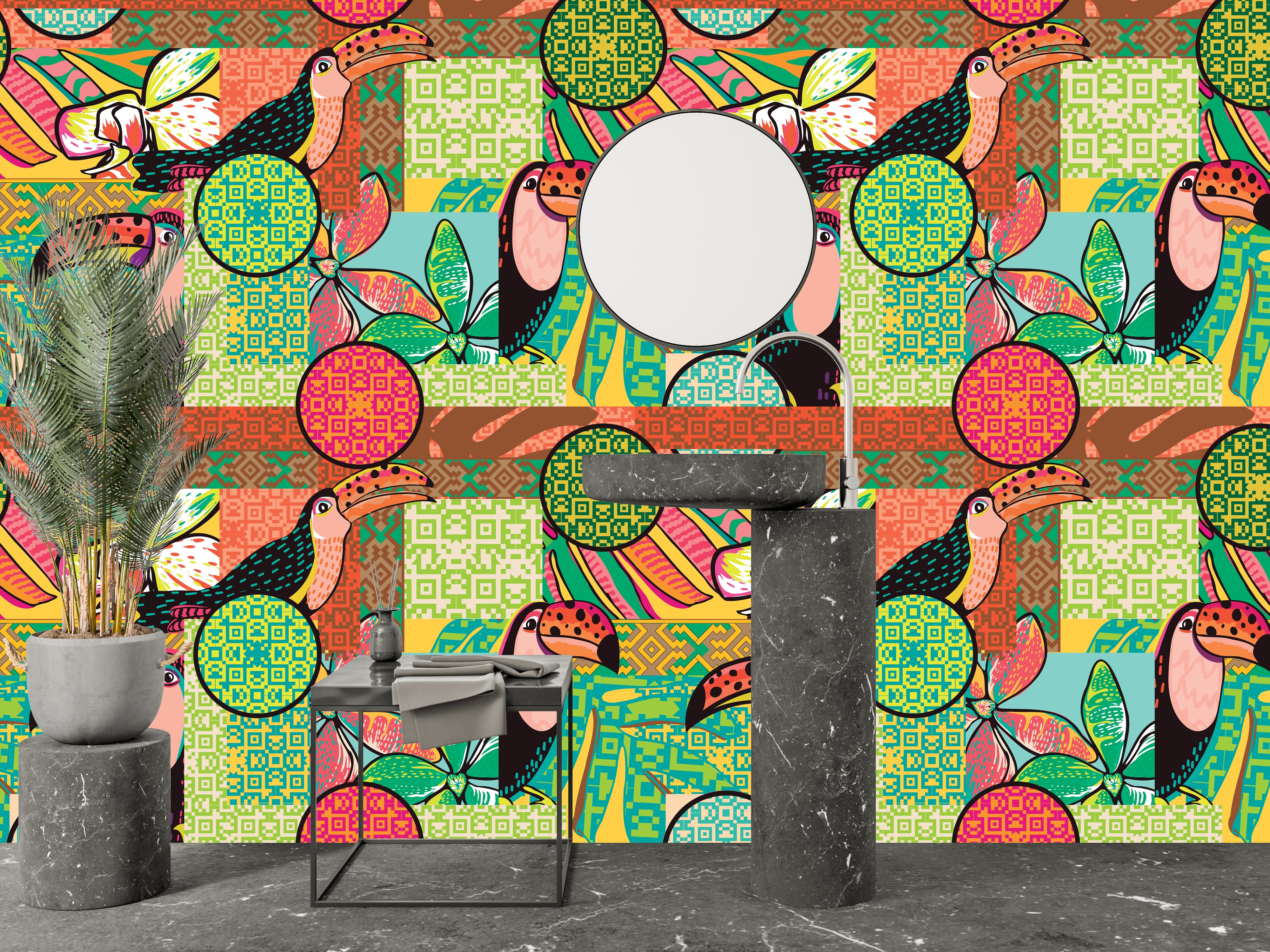 Fun Tropical Wallpaper, Toucan and Amazon Motives Mural, Oversized Custom Size Wall Art, Non-Woven, Non-Adhesive, Modern Wall Paper, Removable