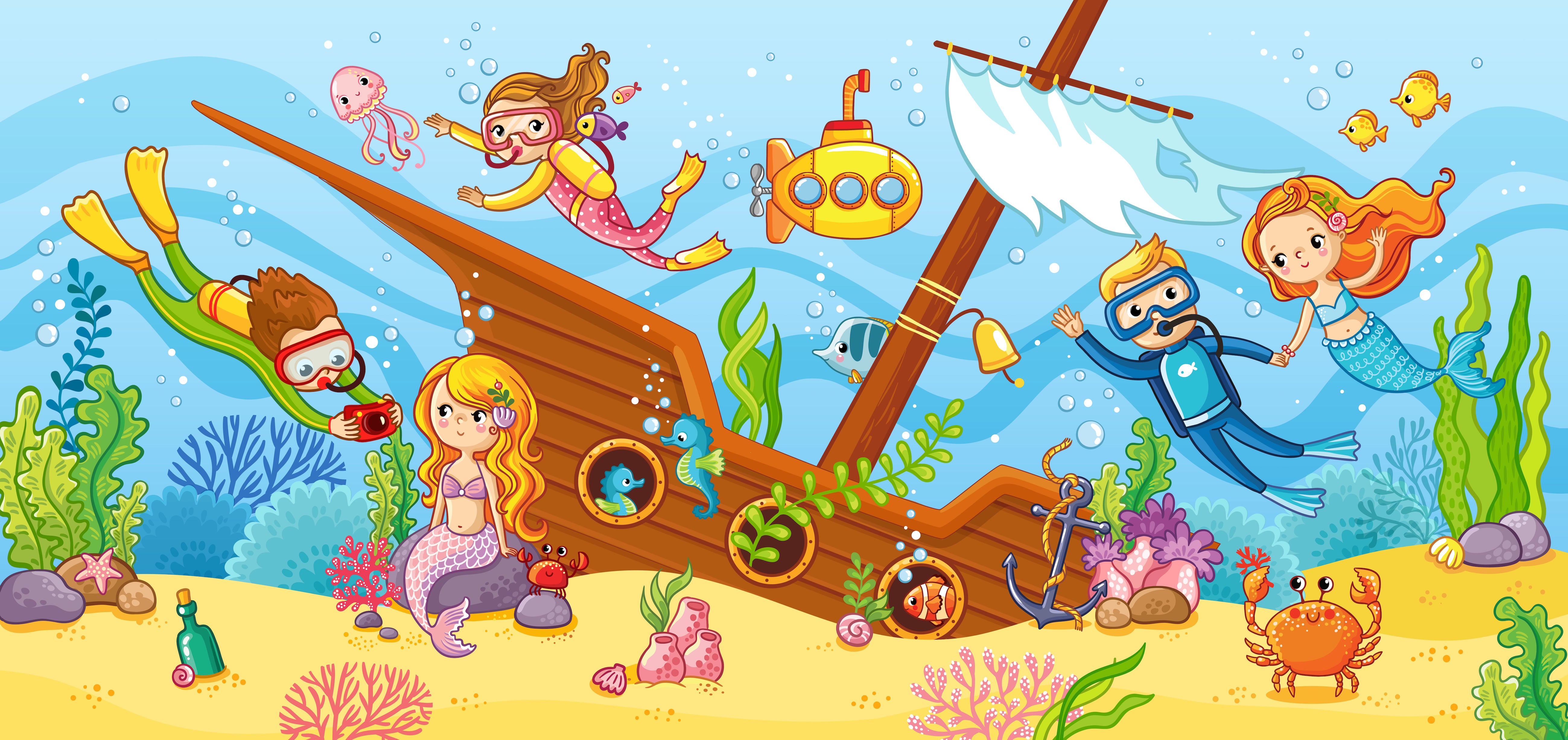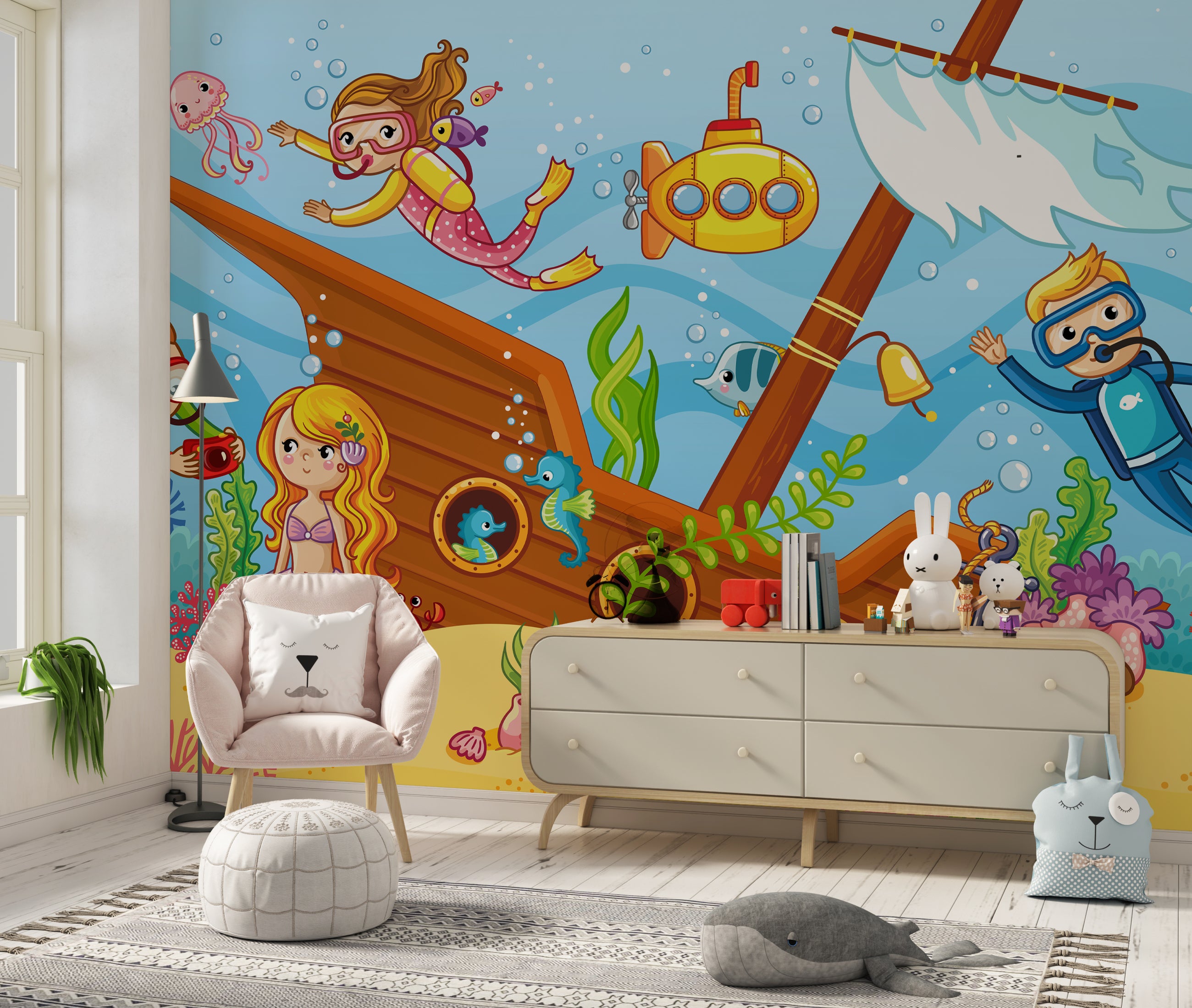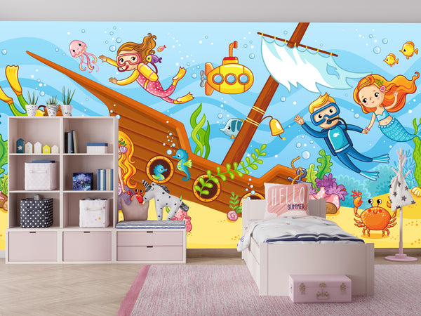 Children Swim Wallpaper, Mermaids Mural, Oversized Custom Size Wall Art, Non-Woven, Non-Adhesive, Modern Wall Paper, Removable