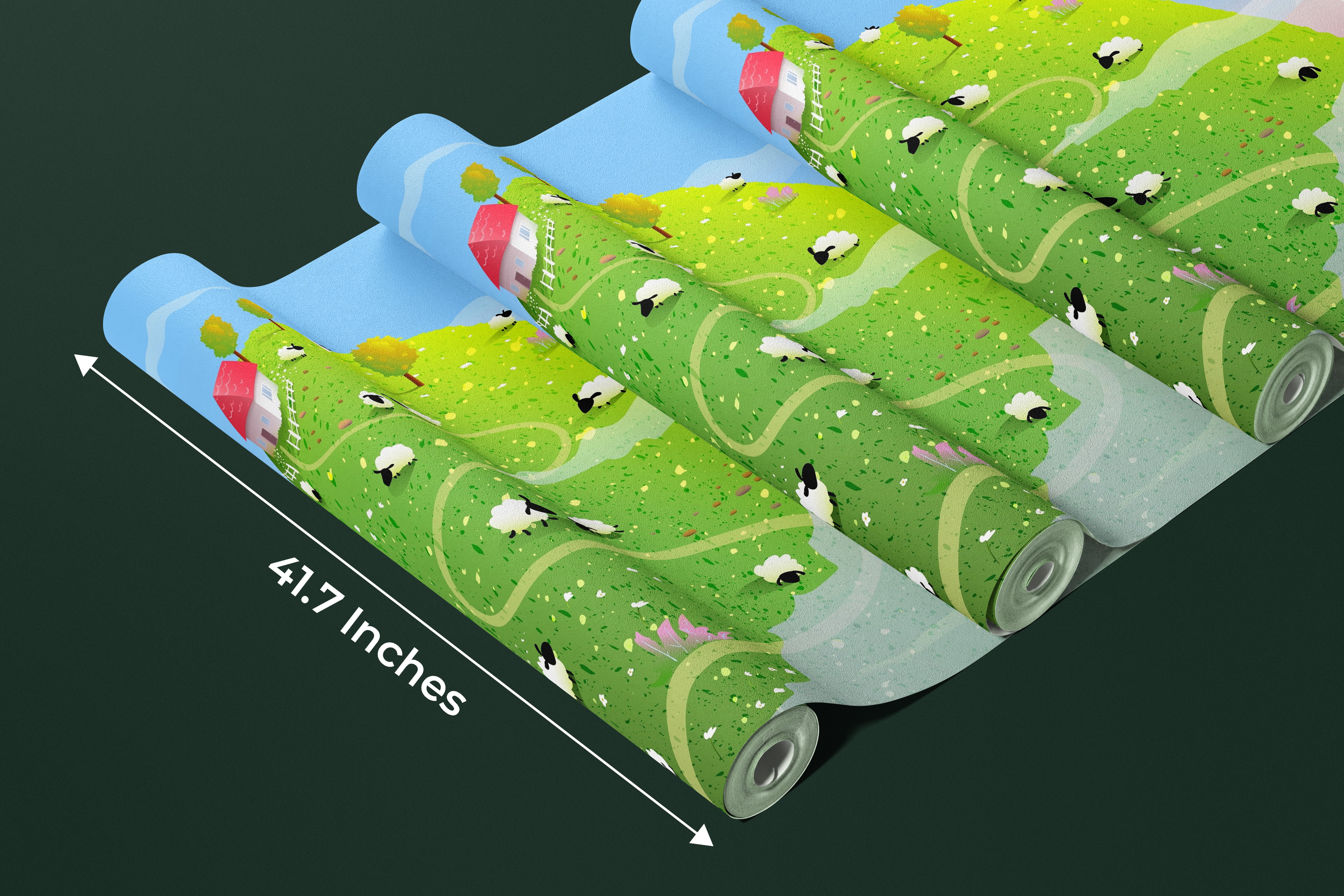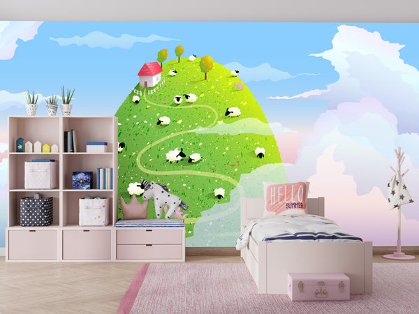 Green Hill Wallpaper, Sheep Mural, Oversized Custom Size Wall Art, Non-Woven, Non-Adhesive, Modern Wall Paper, Removable