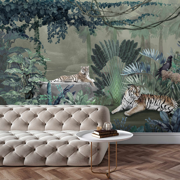 jungle Tigers Wall Mural, Green Nature Forest Theme Wallpaper, Custom Large Wall Mural, Non-Adhesive, Washable, Removable Wall Paper, Birds, Non-Woven Back
