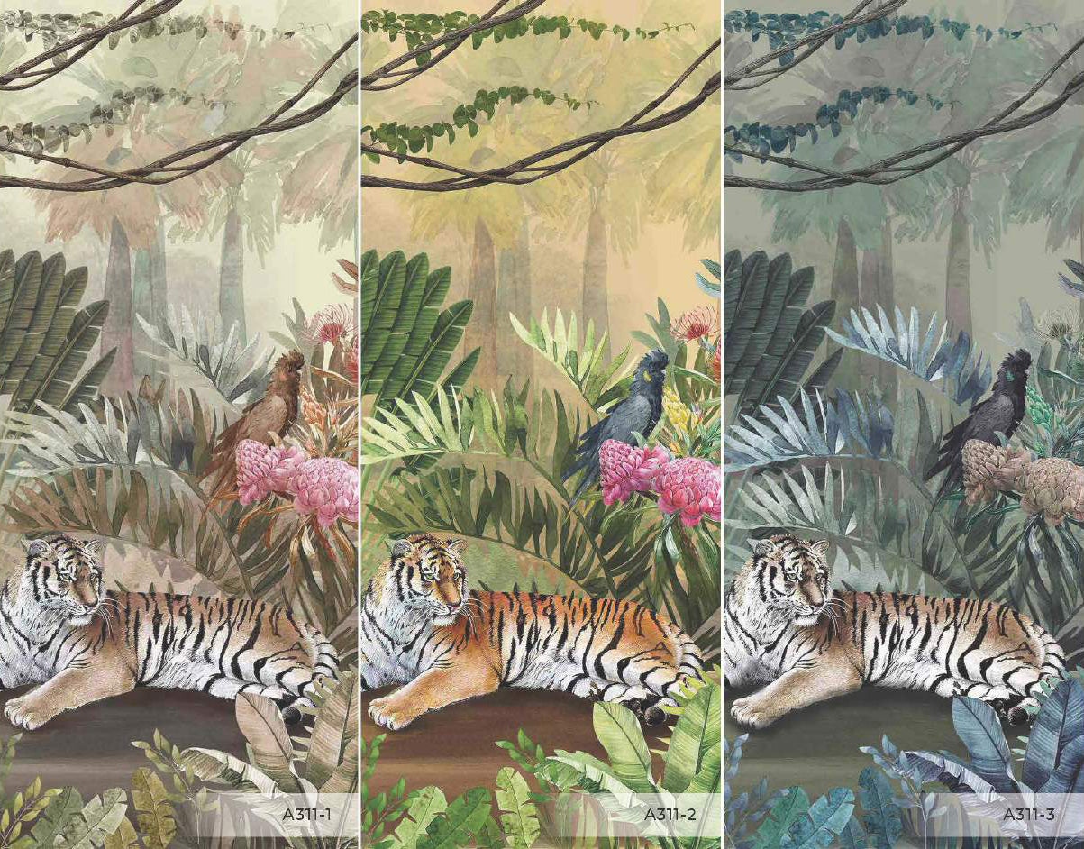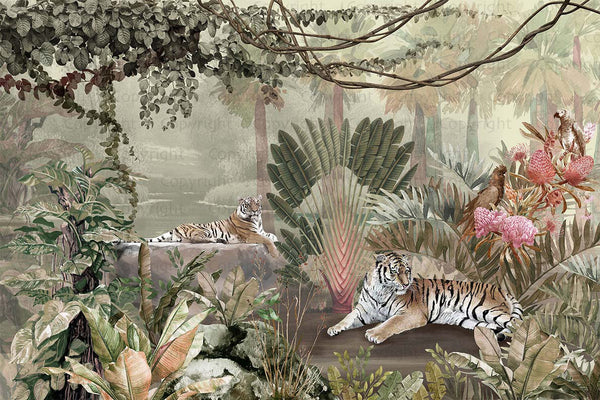jungle Tigers Wall Mural, Ivory Nature Forest Theme Wallpaper, Custom Large Wall Mural, Non-Adhesive, Washable, Removable Wall Paper, Birds, Non-Woven Back