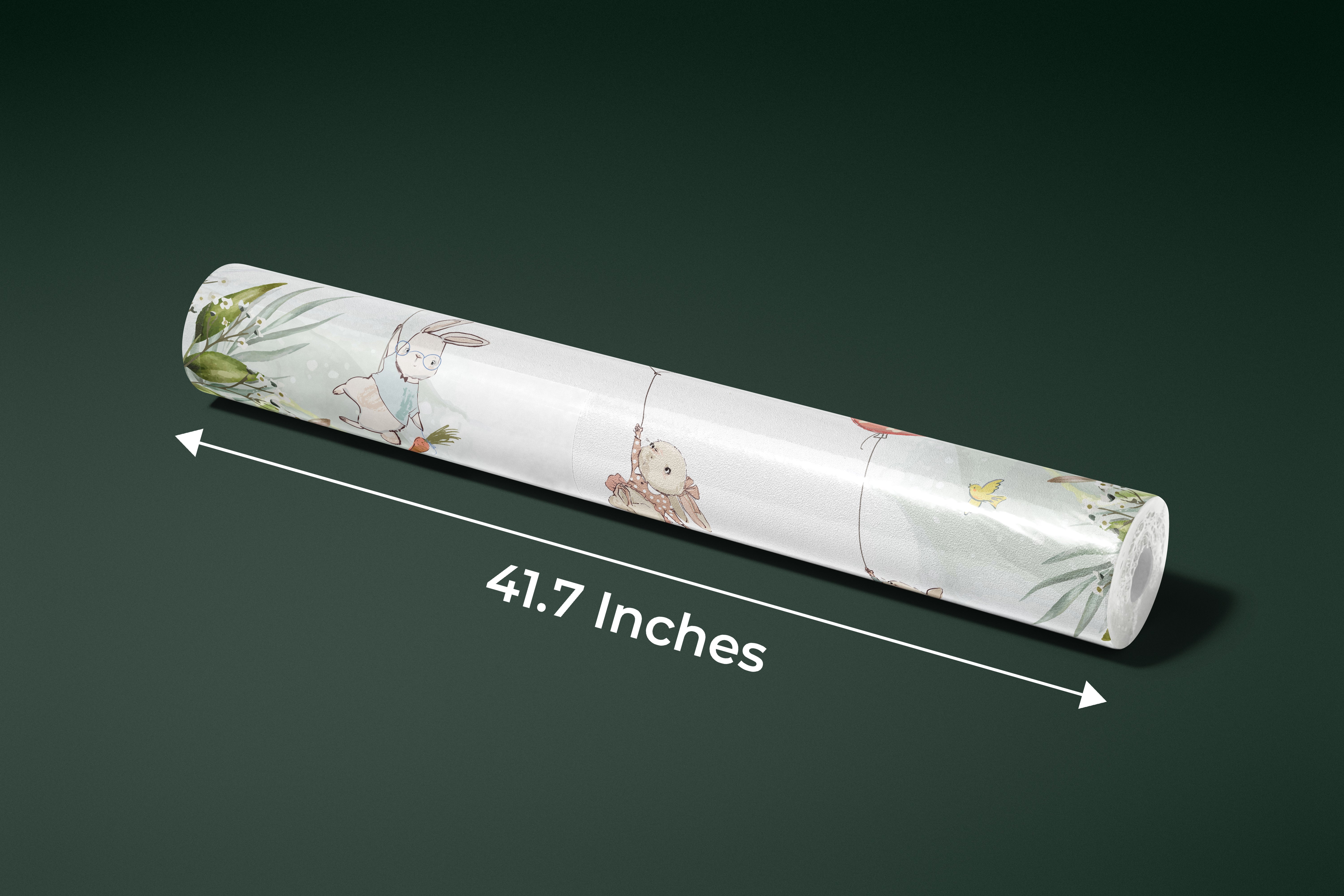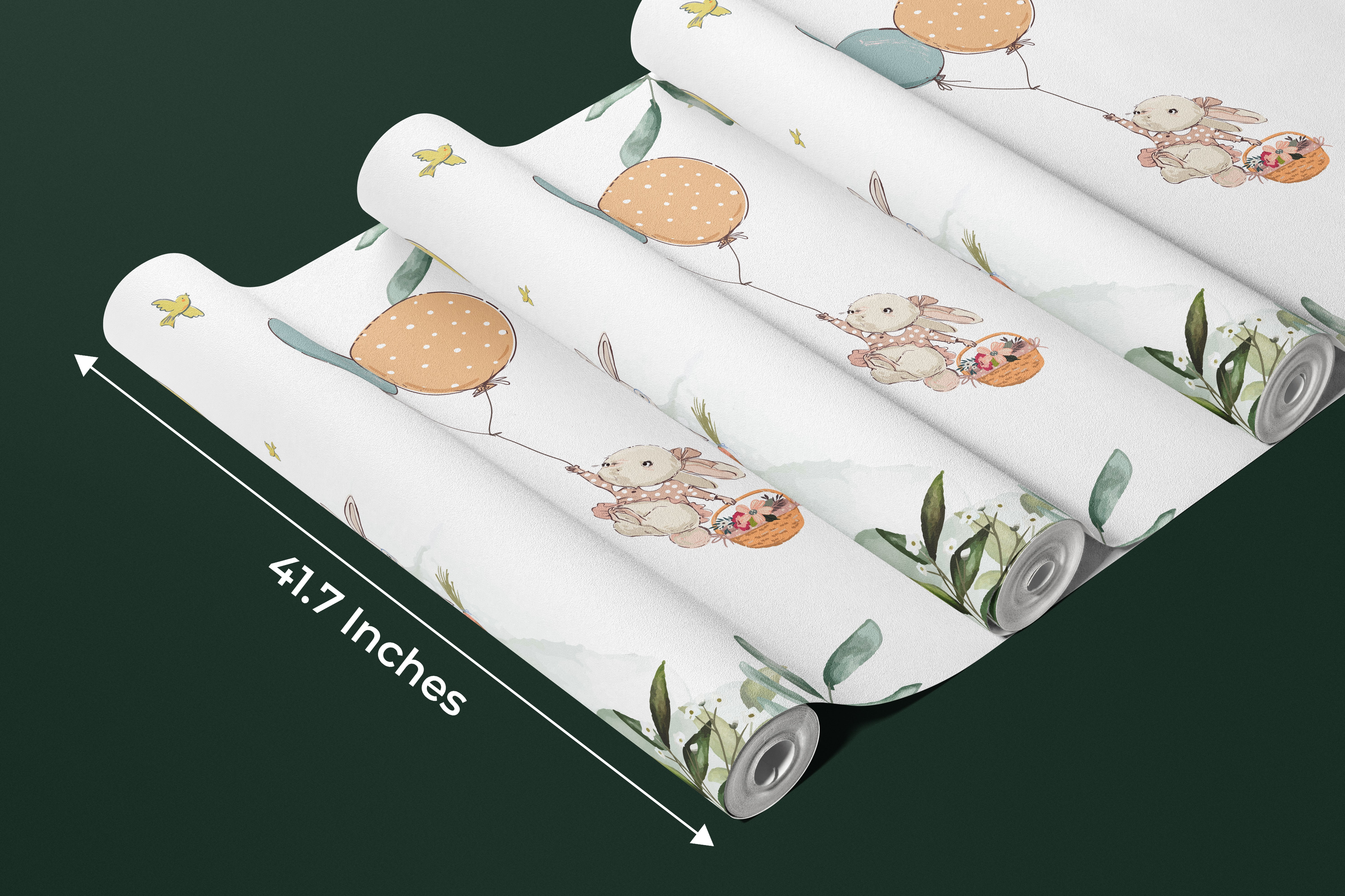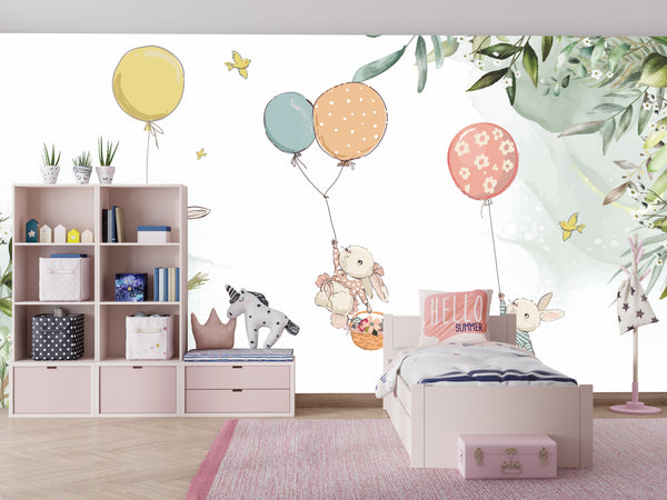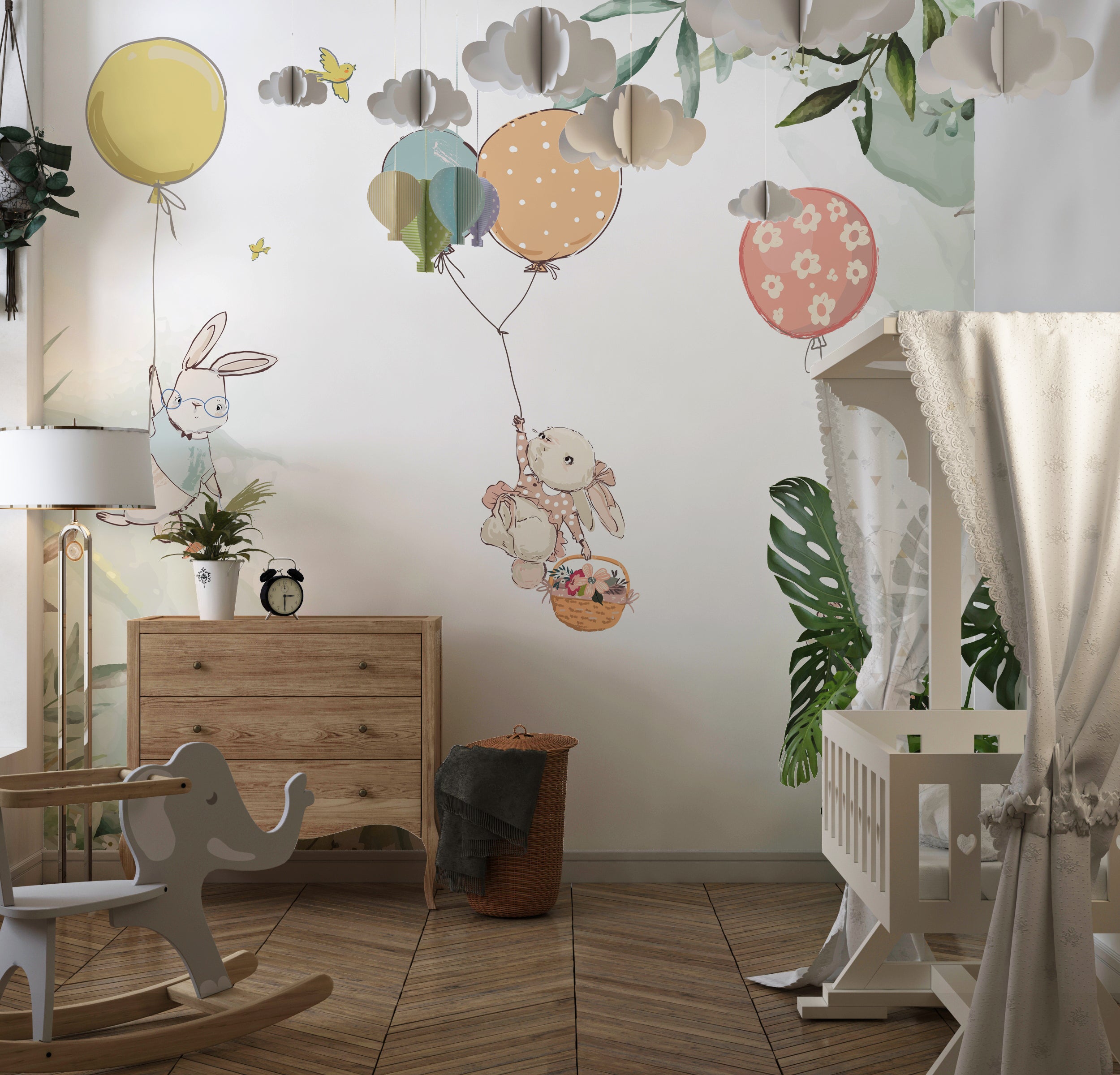 Bunnies Wallpaper, Fly Balloons Mural, Oversized Custom Size Wall Art, Non-Woven, Non-Adhesive, Modern Wall Paper, Removable
