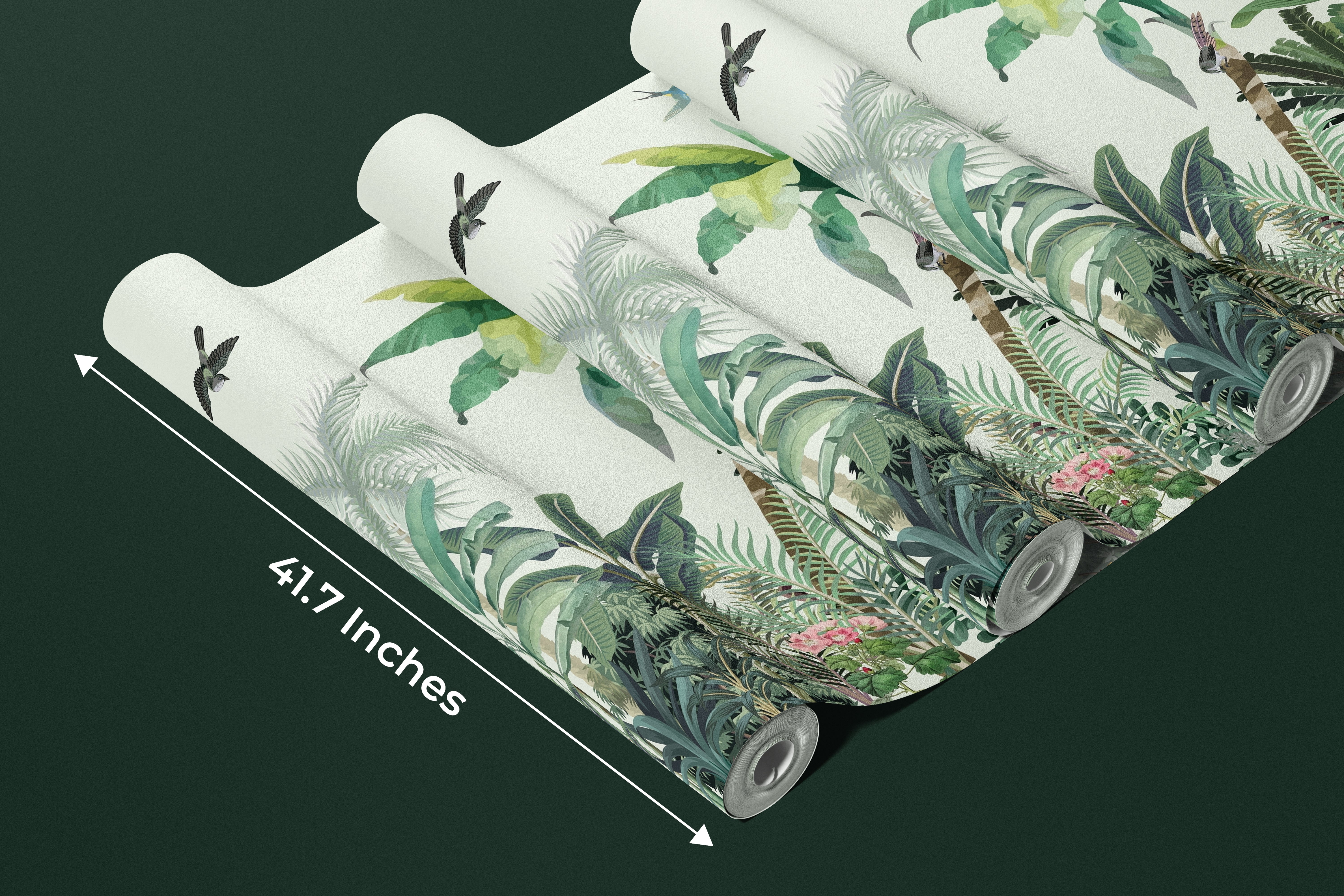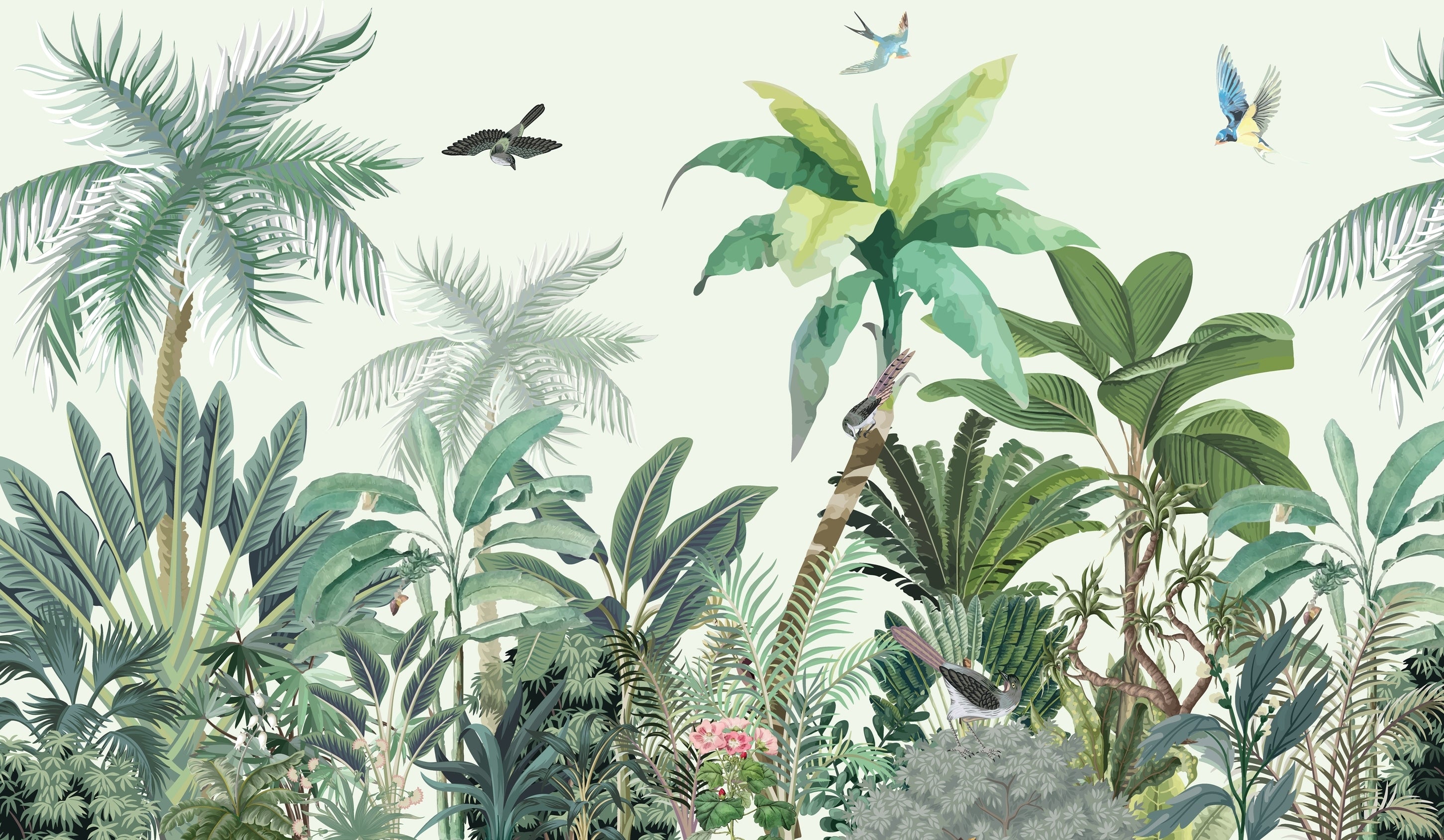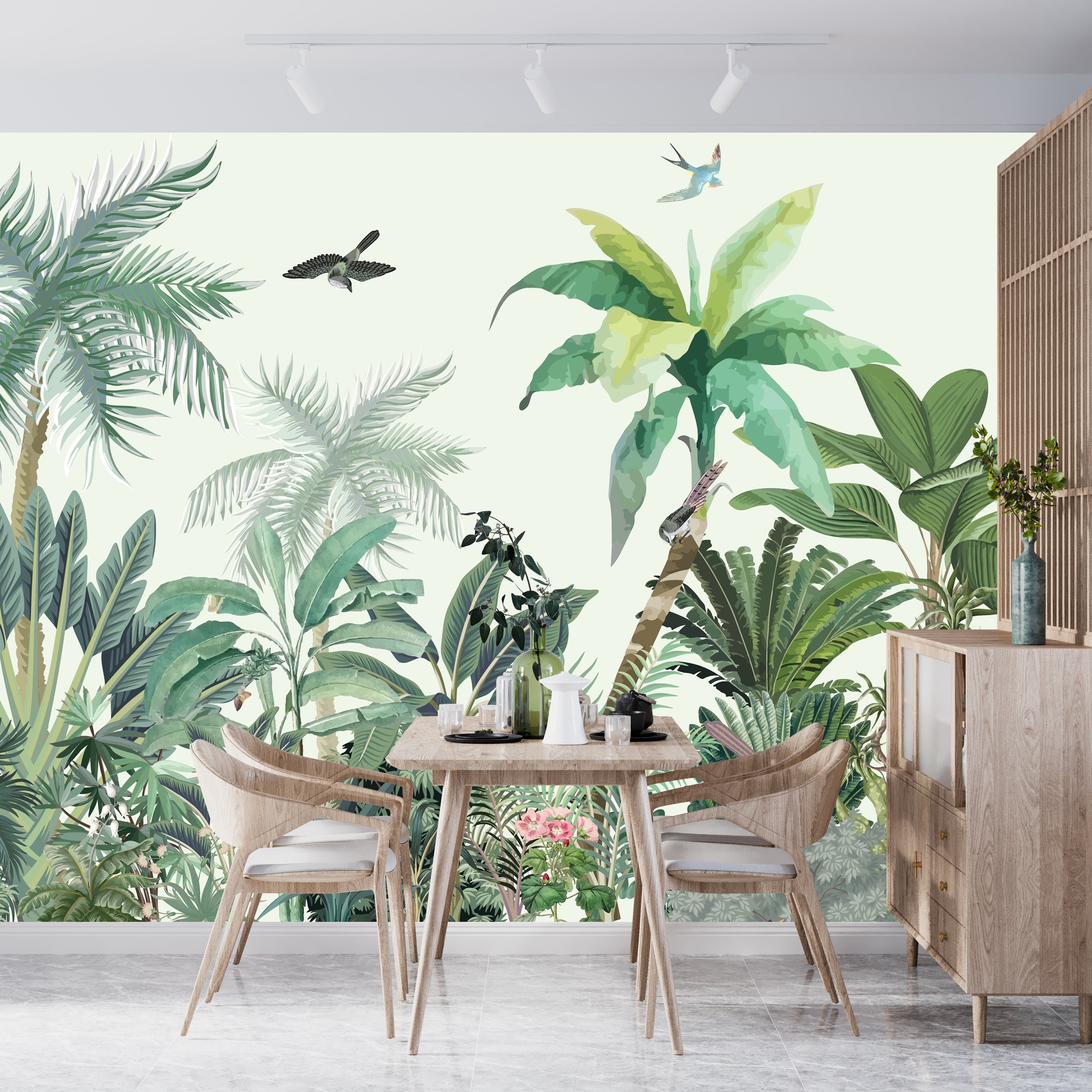 Jungle Palms Wallpaper, Birds Mural, Oversized Custom Size Wall Art, Non-Woven, Non-Adhesive, Modern Wall Paper, Removable