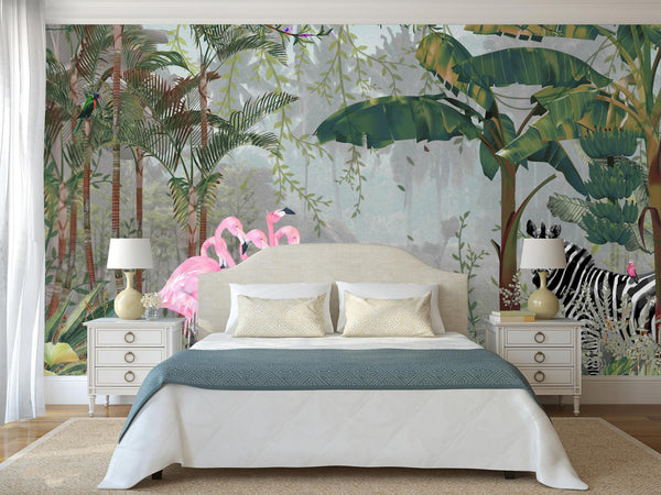 Tropical Forest Wall Mural, Flamingos, Zebra, Animals Wallpaper, Custom Size, Dark Green Oversized Print, Wall Art, Nature Theme, Jungle, Removable